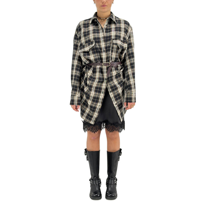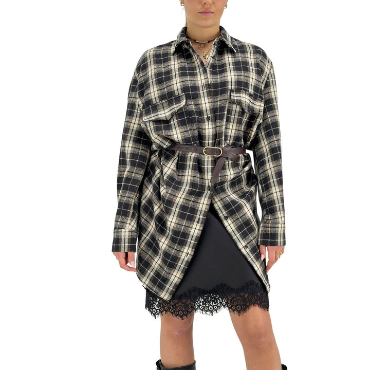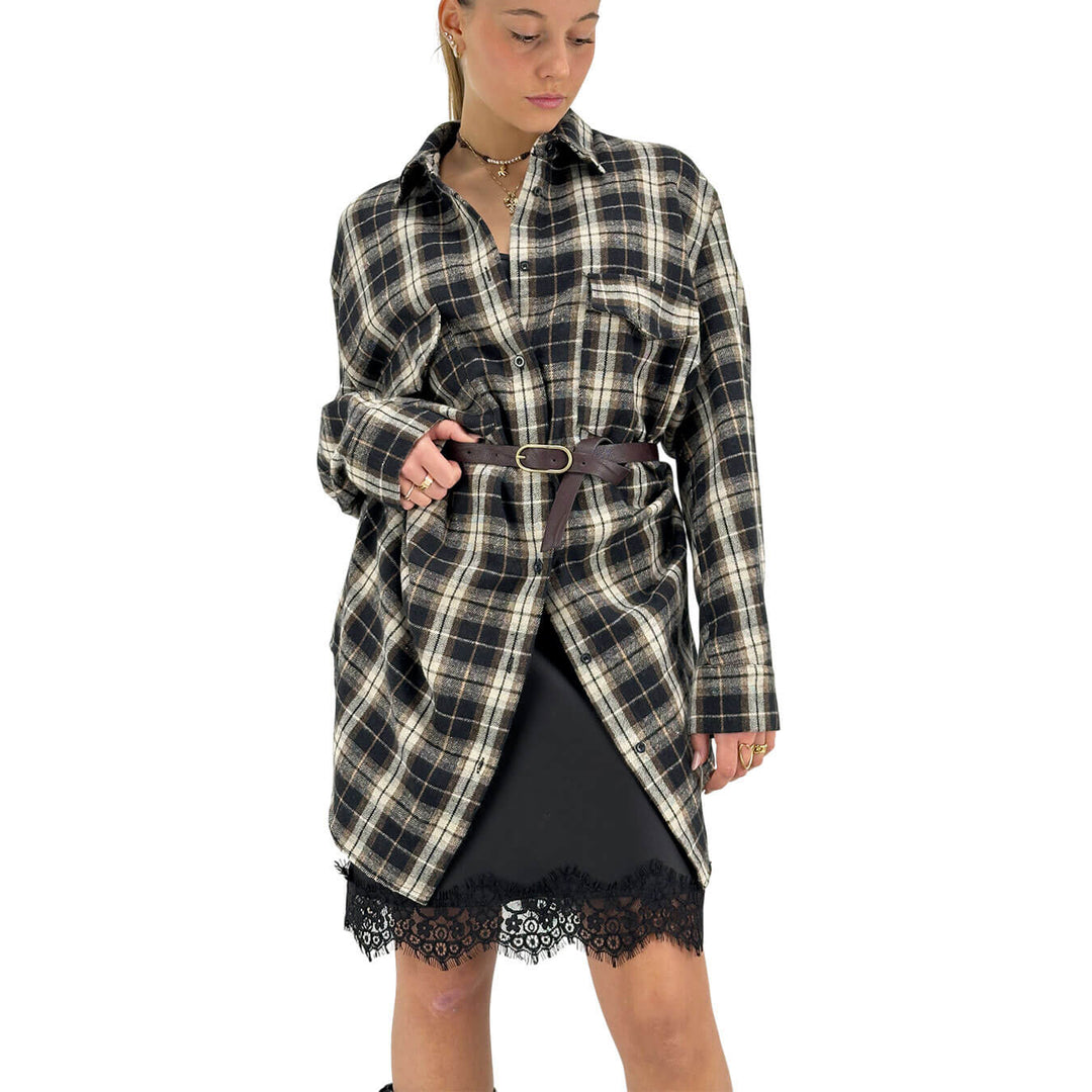 L’abito nero e marrone check Tensione In unisce eleganza e comfort con uno stile camicia contemporaneo. Realizzato in 65% cotone, 30% poliestere e 5% tessuto organico, presenta sottoveste nera, tasche frontali e cintura marrone in dotazione per valorizzare la silhouette. Perfetto per look da città o occasioni smart-casual, si abbina facilmente a stivaletti, décolleté o sneakers per un outfit versatile e di tendenza. Codice: 25fw250071