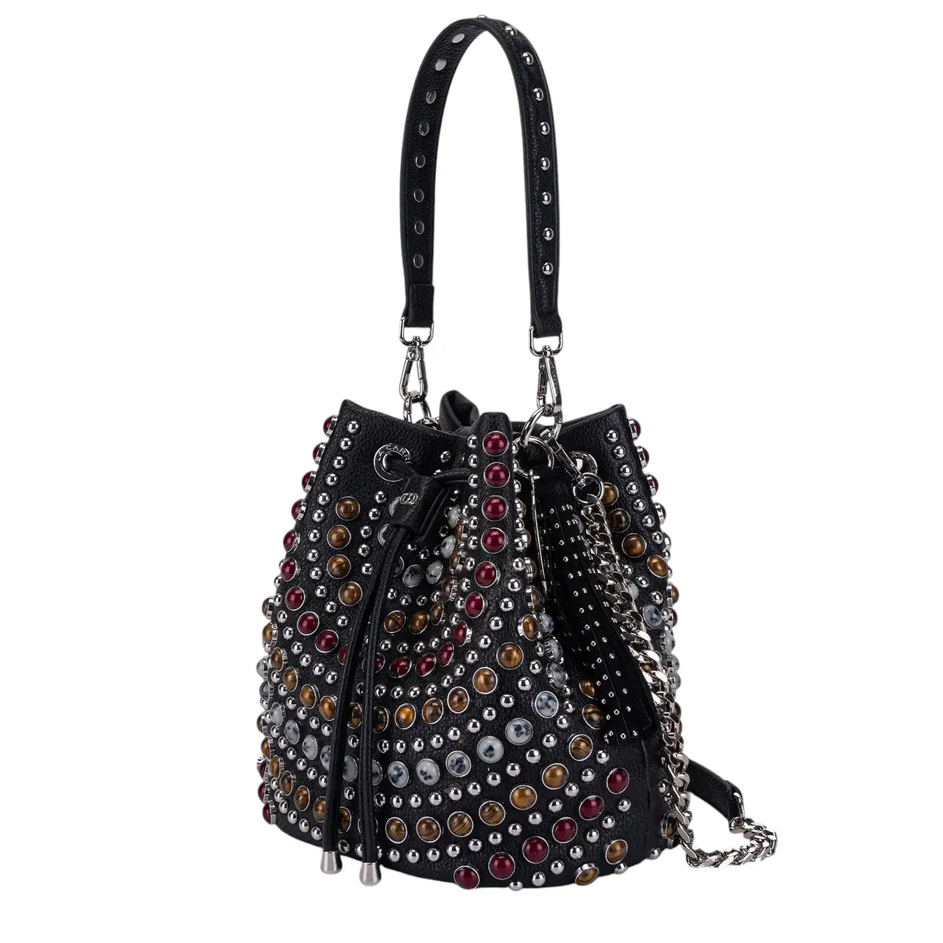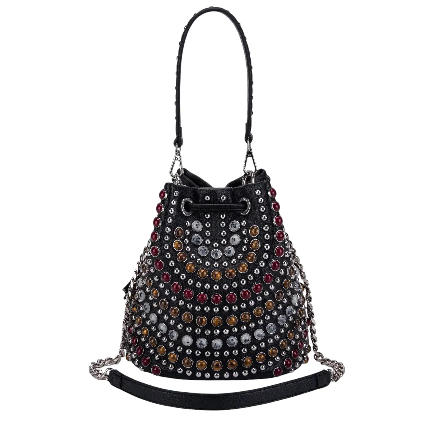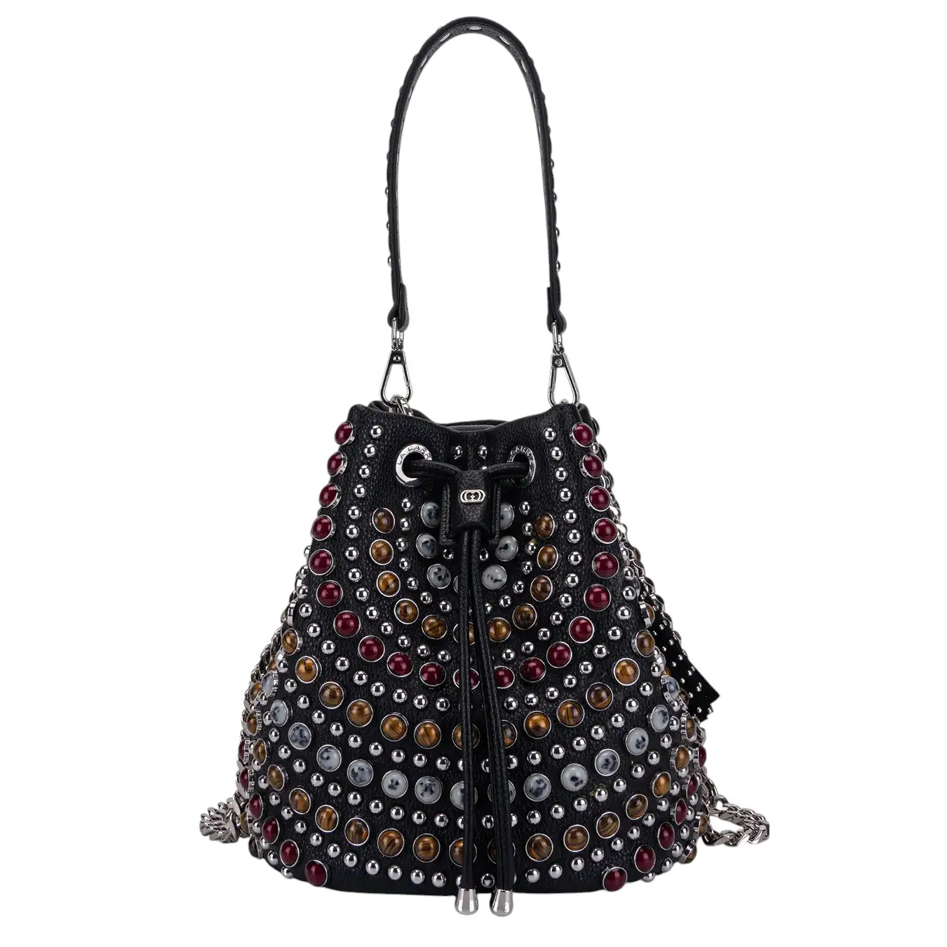 Il secchiello La Carrie Andromeda Stones in ecopelle martellata nera unisce eleganza e personalità grazie alle applicazioni di borchie e pietre dure con cabochon che donano un effetto luminoso e sofisticato. Le misure 26x19x28 cm assicurano praticità quotidiana, mentre manico e tracolla rimovibili permettono di passare da uno stile casual a uno più ricercato. Un accessorio di tendenza che valorizza ogni outfit.