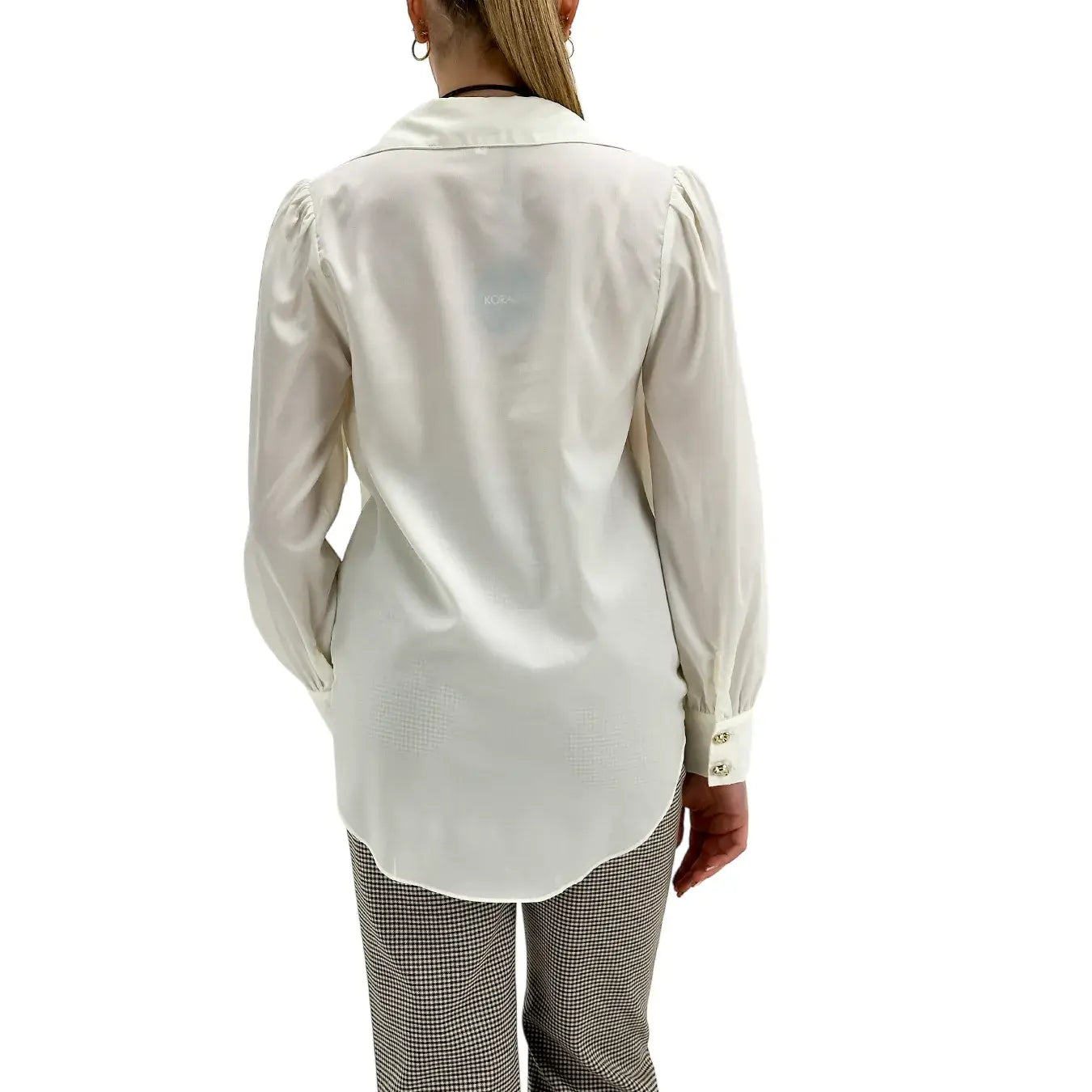 La blusa Koralline panna asimmetrica in georgette offre un’eleganza leggera e fluida, valorizzando la silhouette con un movimento morbido e contemporaneo. Il taglio asimmetrico aggiunge carattere e femminilità, rendendola perfetta per look raffinati con pantaloni eleganti o outfit casual chic con denim. Un capo versatile, luminoso e ideale per ogni occasione.