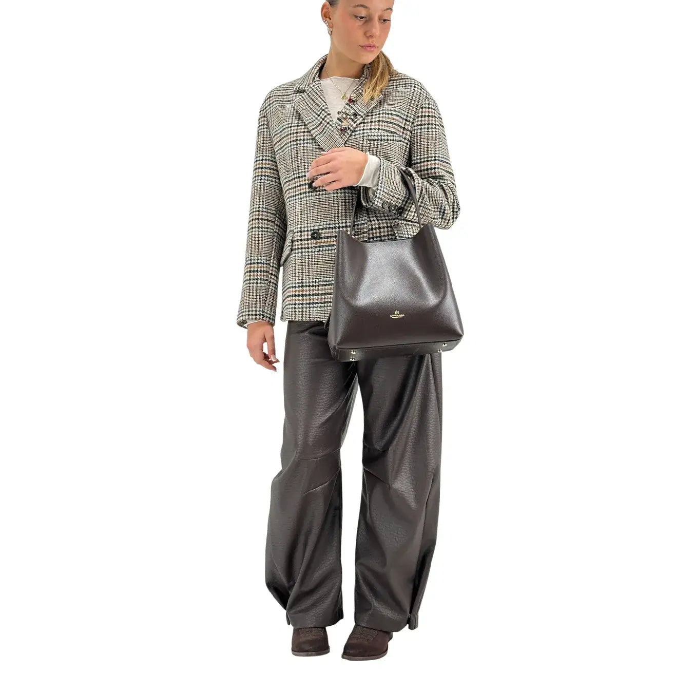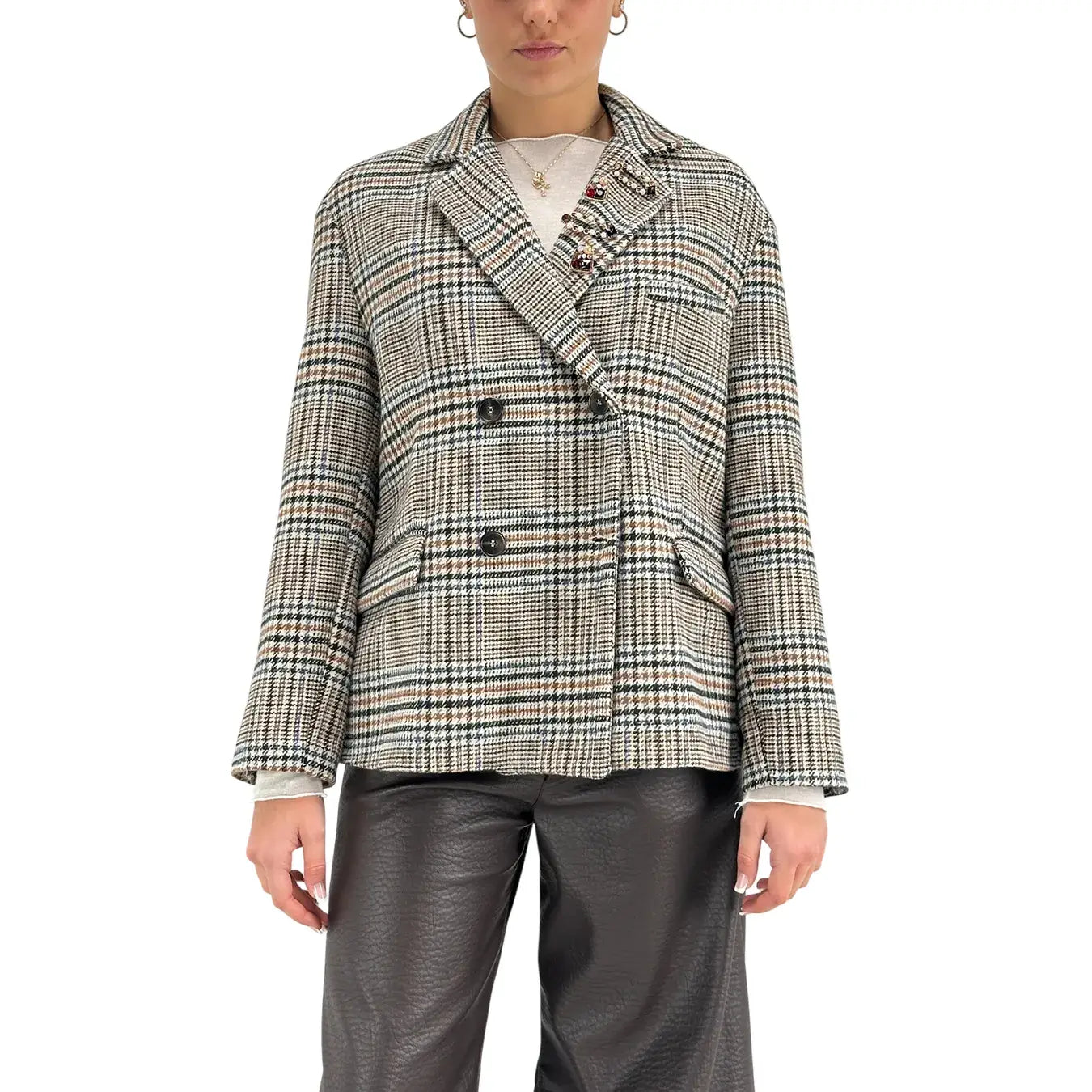 La giacca Tensione in marrone pie de poule a doppio petto con spille decorative unisce stile classico e dettagli contemporanei, offrendo una vestibilità over che garantisce comfort e libertà di movimento. Ideale per outfit casual-chic o look sofisticati da ufficio, si abbina perfettamente a pantaloni sartoriali o jeans per un risultato elegante e di tendenza. Un capo esclusivo che unisce qualità, comfort e stile in ogni occasione. Composizione: 59% poliestere, 14% viscosa, 10% acrilico, 7% poliammide, 5% cotone, 5% altre fibre.