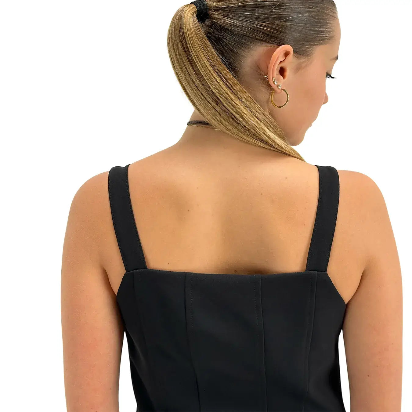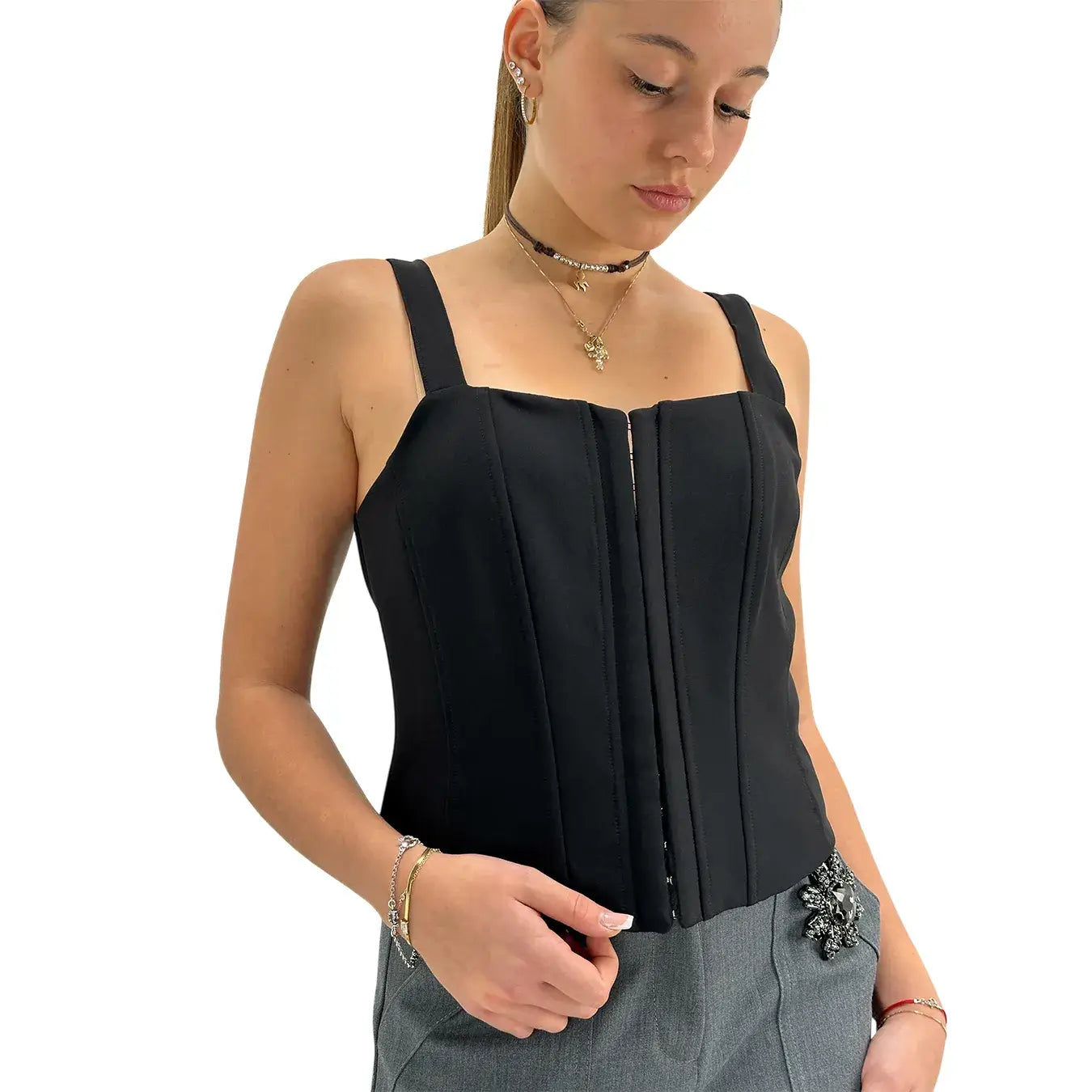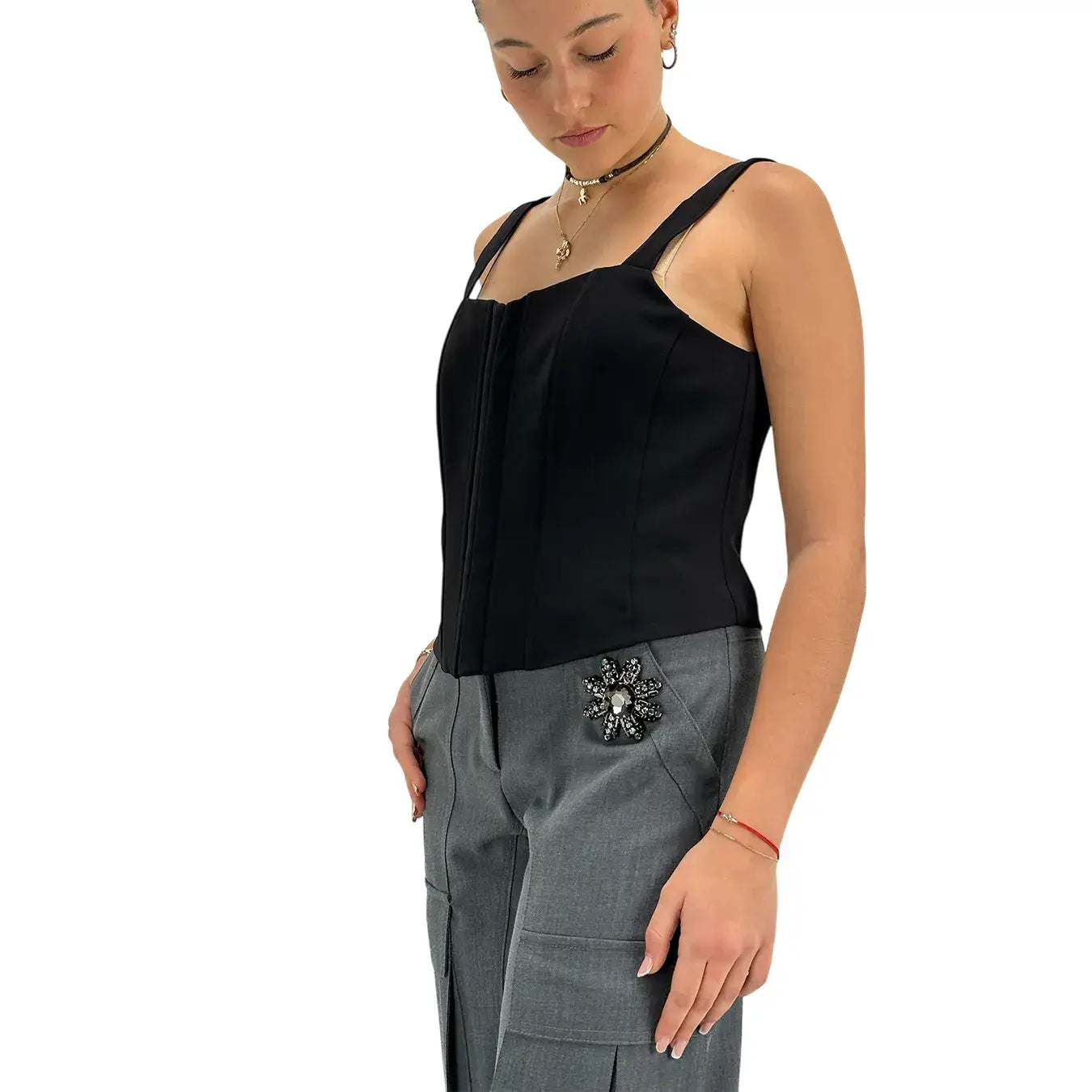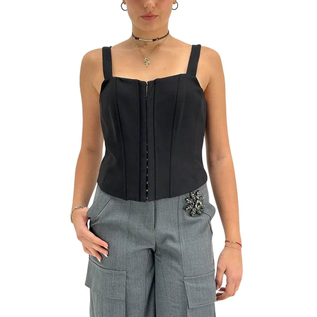 Il bustino Koralline nero con ganci unisce stile deciso e femminilità, valorizzando la silhouette con una vestibilità aderente e modellante. Il tessuto leggero e strutturato garantisce comfort e sostegno, rendendolo perfetto da abbinare a pantaloni a vita alta, gonne eleganti o come capo da layering sotto blazer. Un capo moderno, di tendenza e ideale per look sofisticati.