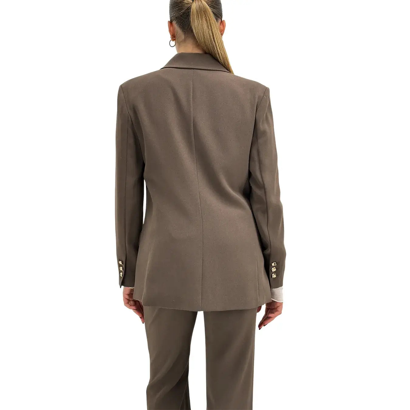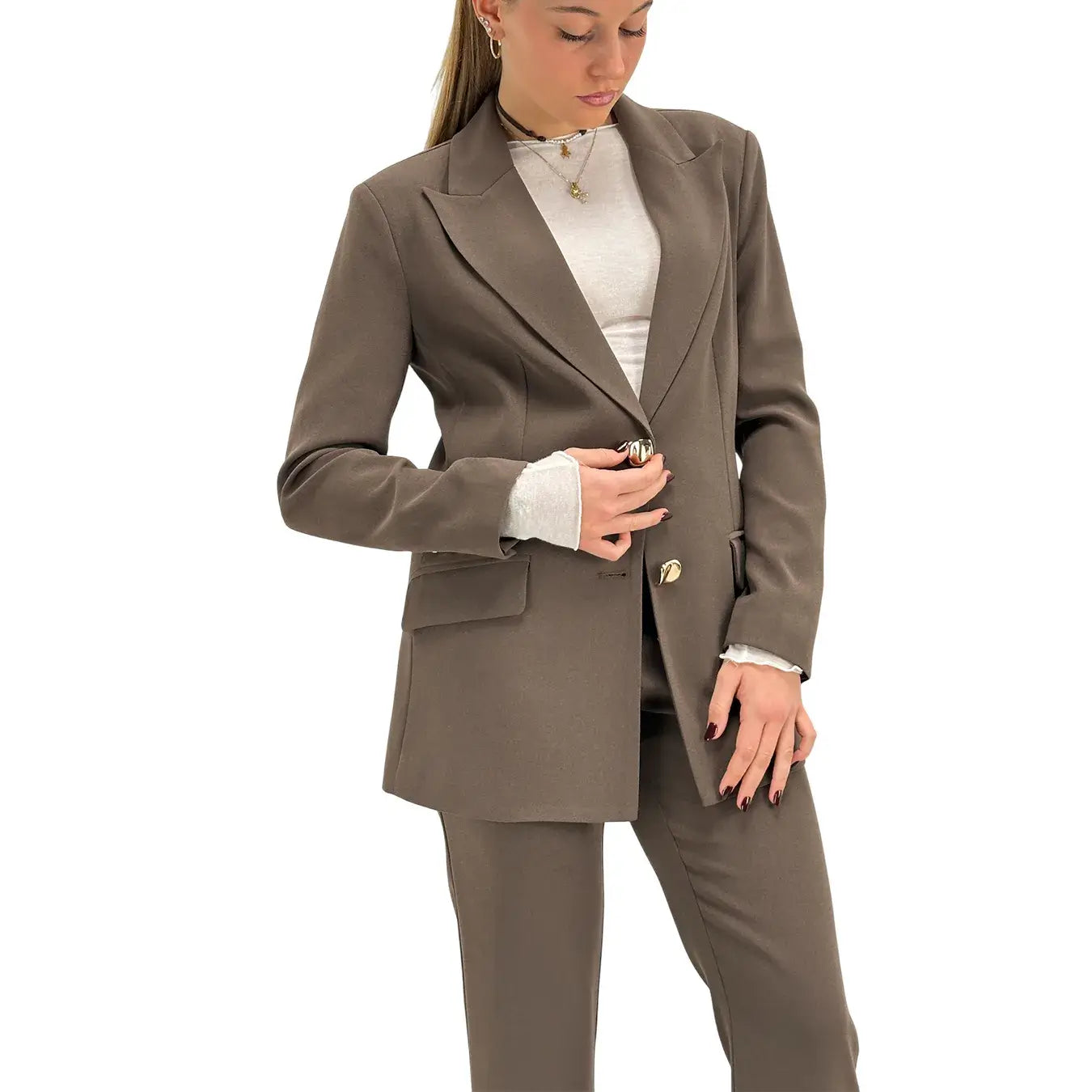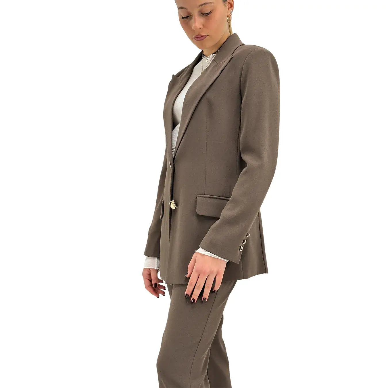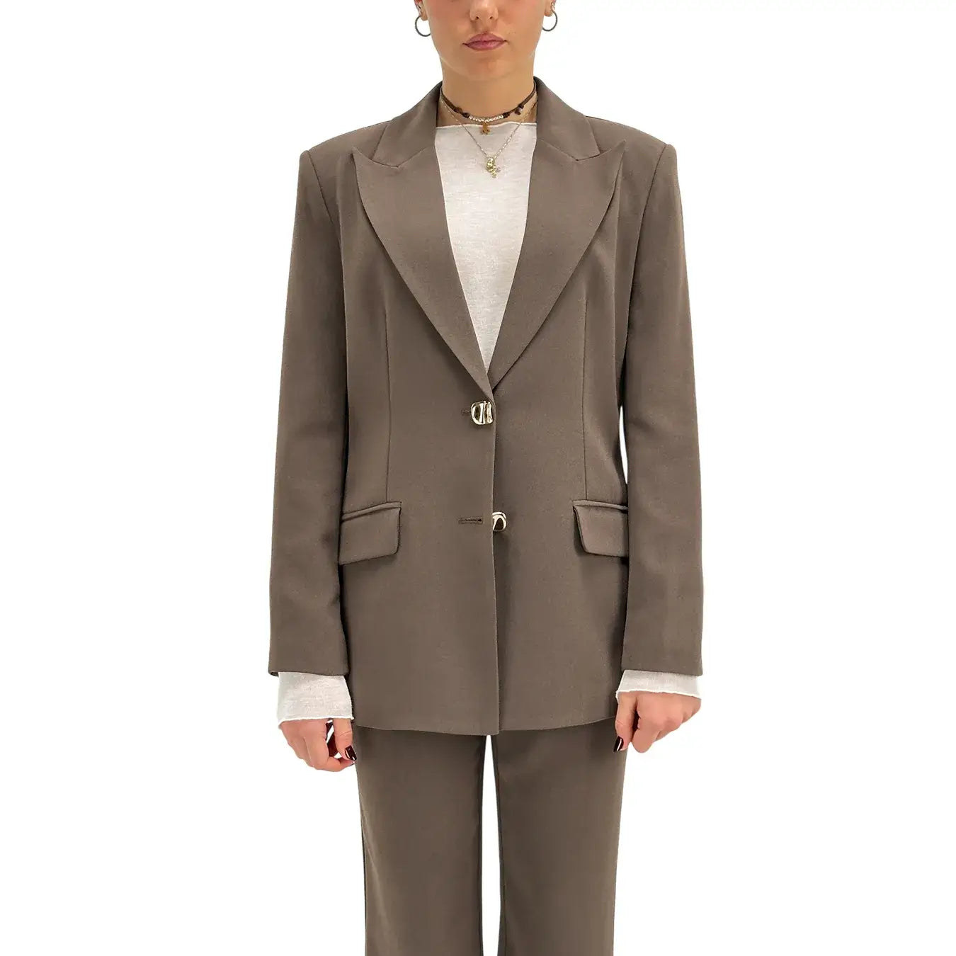 Giacca Koralline in tonalità fango, dalla linea lunga e moderna, progettata con chiusura a due bottoni che slancia la figura e aggiunge un tocco di eleganza quotidiana. Il tessuto leggero offre comfort e pulizia visiva, ideale per look da ufficio, uscite serali o abbinata a jeans e top minimal per uno stile contemporaneo e ricercato. Una scelta versatile e di tendenza da indossare con carattere.