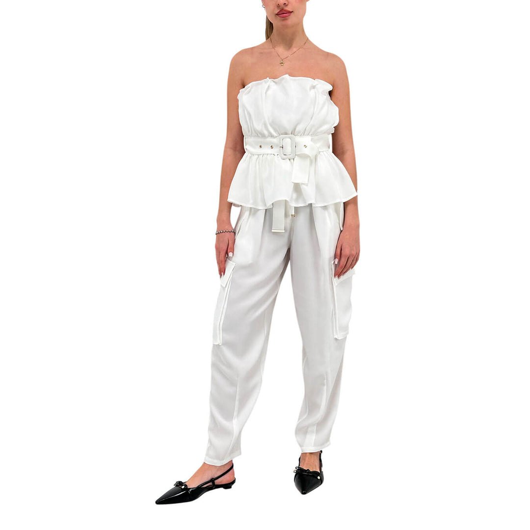 Koralline top donna senza spalline, con elegante modello volant che aggiunge movimento e femminilità. Il fondo svasato crea un effetto leggero e fluido, mentre la cintura con fibbia in vita definisce la silhouette, aggiungendo un tocco chic e sofisticato. Perfetto per look estivi o serate speciali. Colore bianco. Composizione: 100% poliestere.