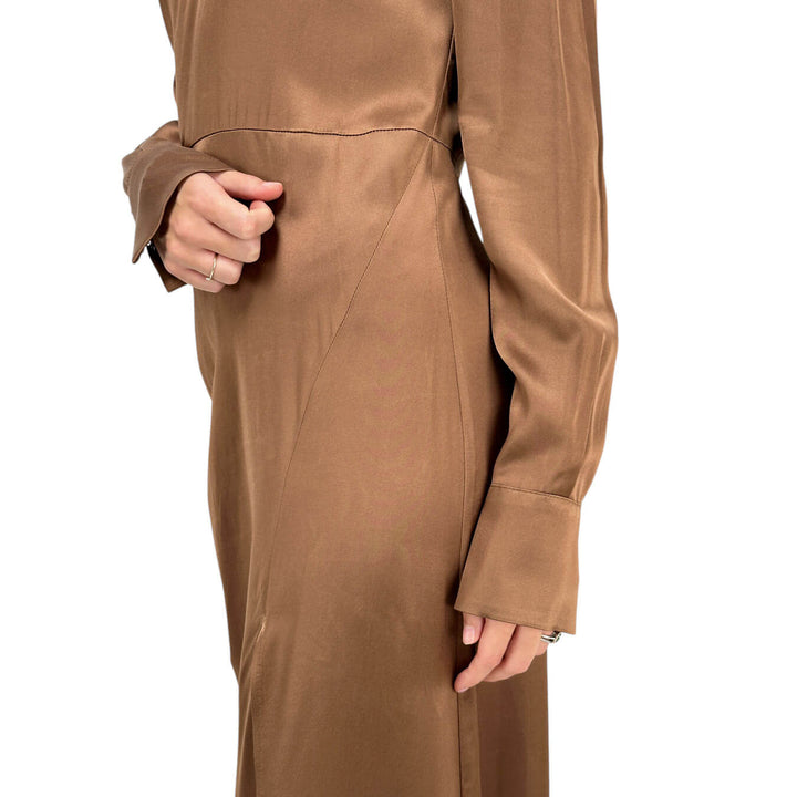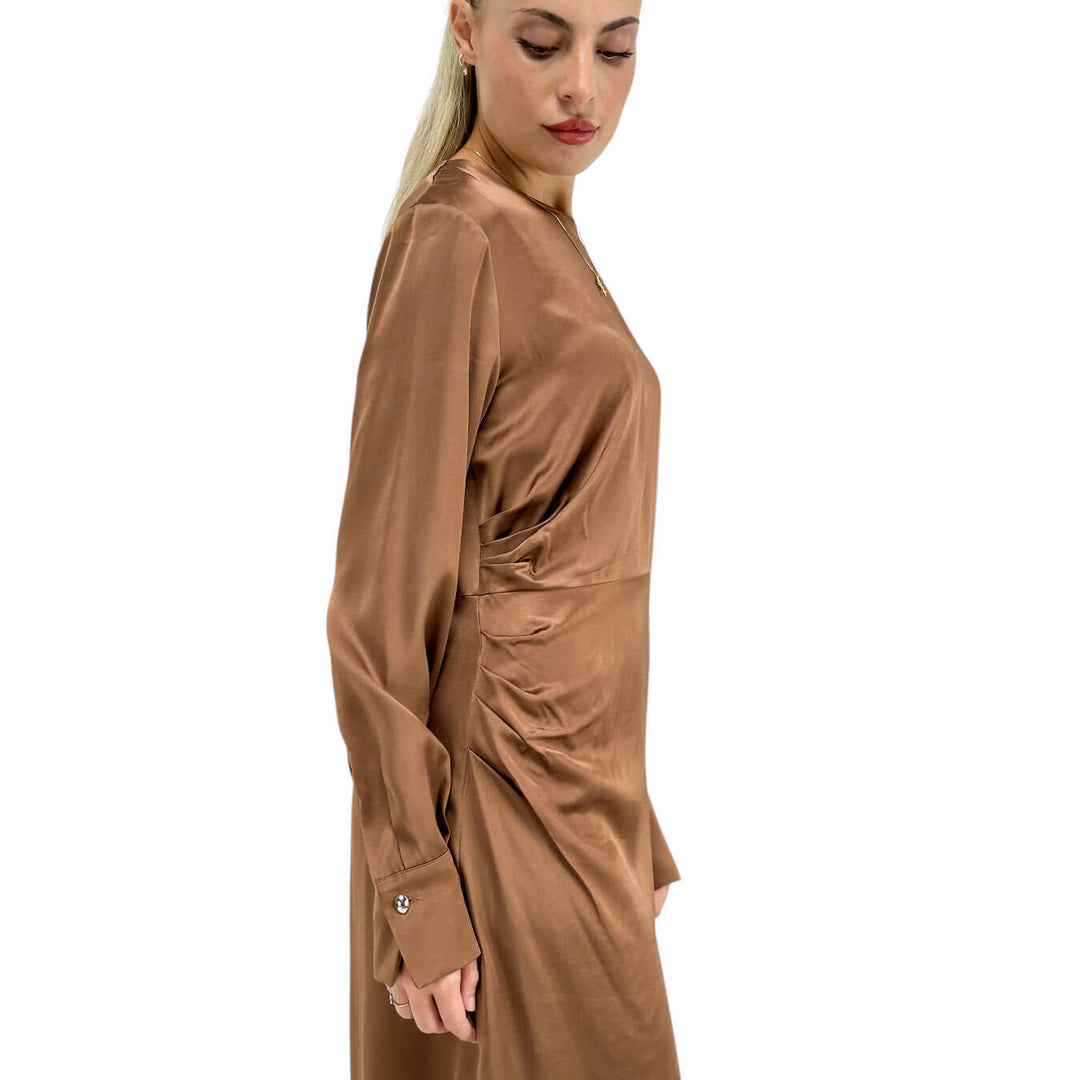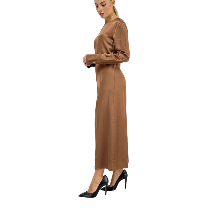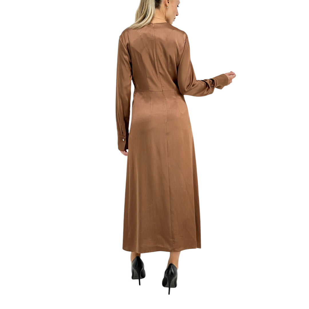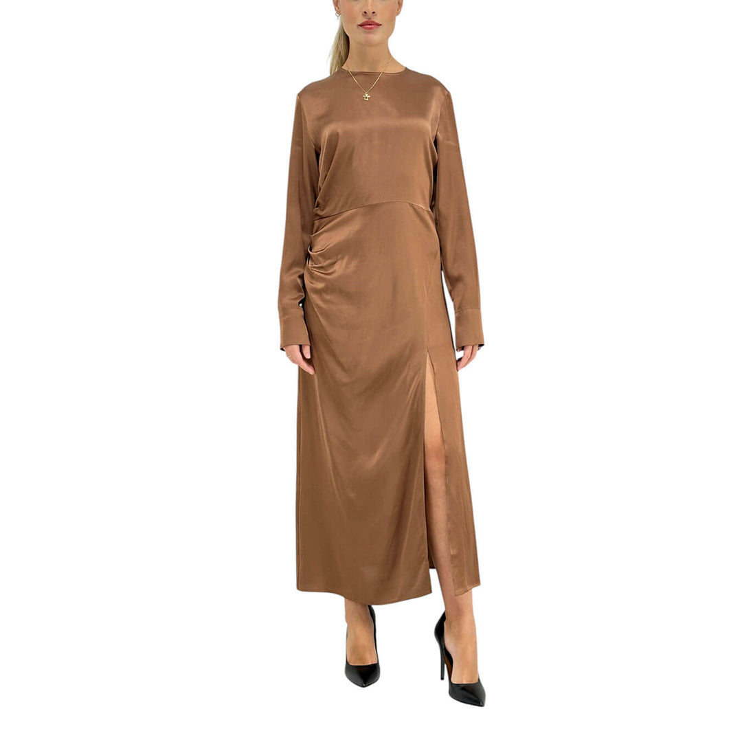 Ottod'ame abito lungo realizzato in morbido raso di viscosa, presenta un elegante scollo tondo e uno spacco frontale che valorizza la figura femminile. Colore Marrone. Composizione 100% viscosa.