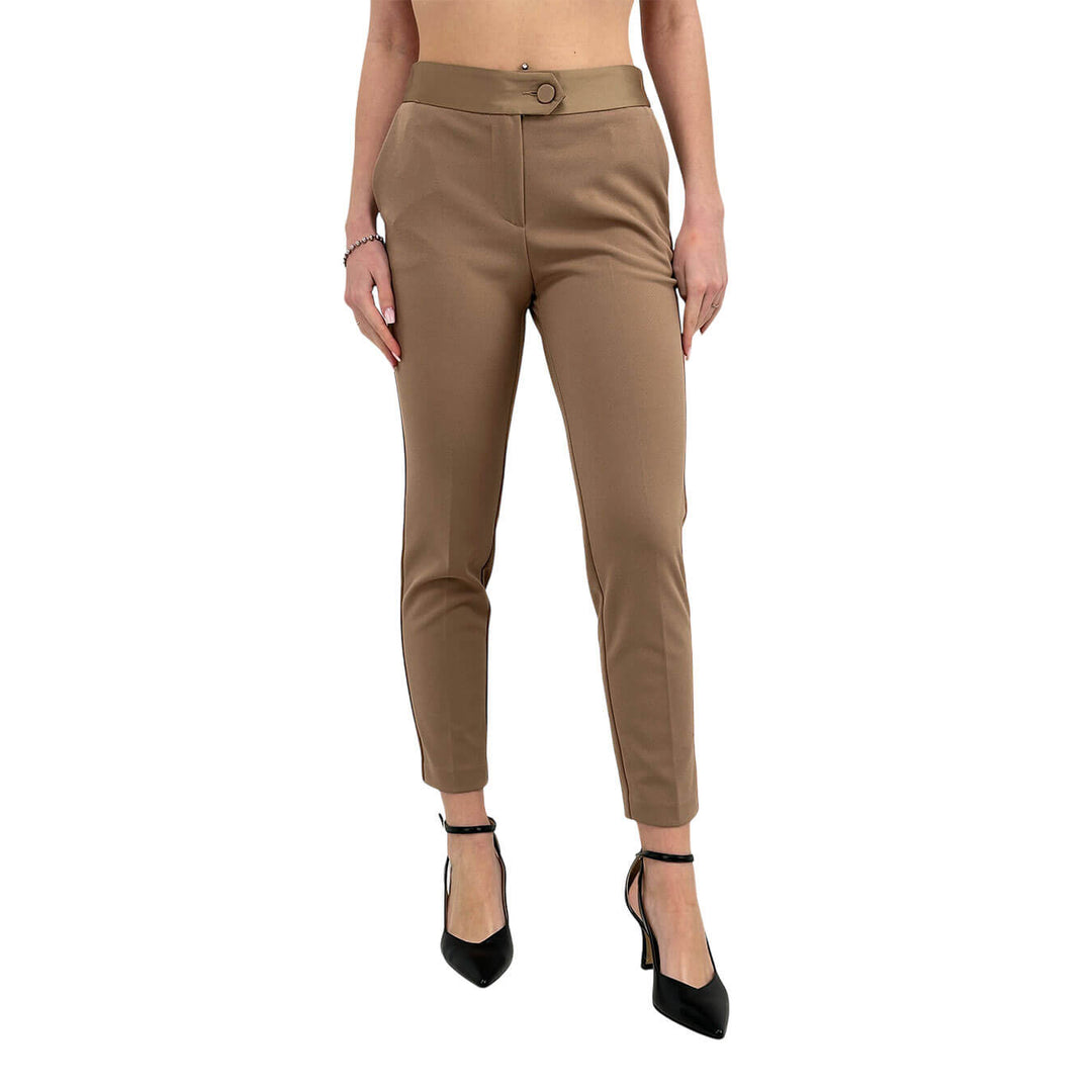 Imperial pantaloni donna dal taglio stretto, fondo alla caviglia per una vestibilità casual e chic. Realizzati con tessuto misto di ottima qualità. Chiusura con zip frontale e bottone, garantisce una vestibilità aderente. Questo pantalone unisce funzionalità e stile. Composizione: 95% poliestere, 5% elastan. Colore beige. Vestibilità regolare.