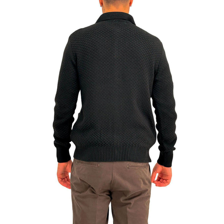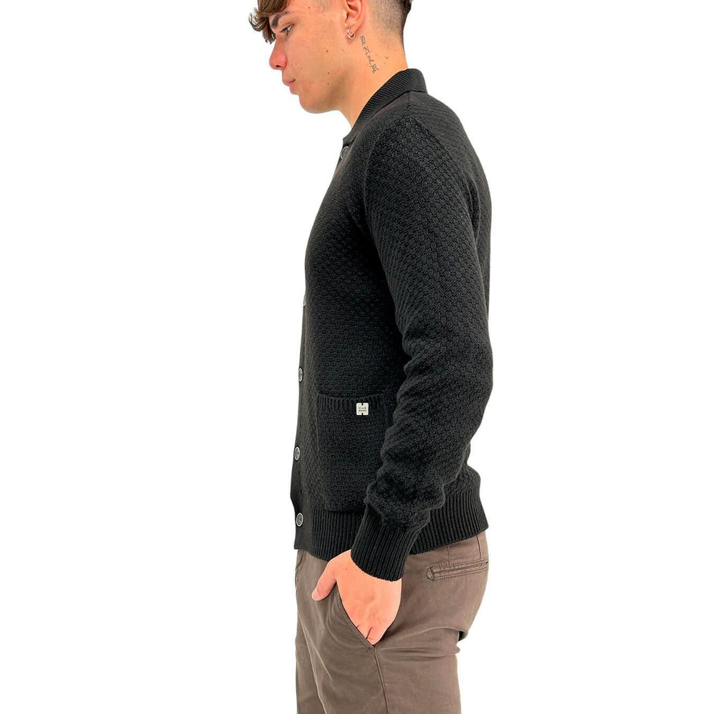 BL.11 Block Eleven men's cardigan, made of a wool blend with a honeycomb weave. Featuring a classic collar, long sleeves and a button closure. Practical open side pockets for a casual and refined look. Perfect for a warm and versatile style. Black color. Composition: 50% wool, 50% acrylic. Slim fit.