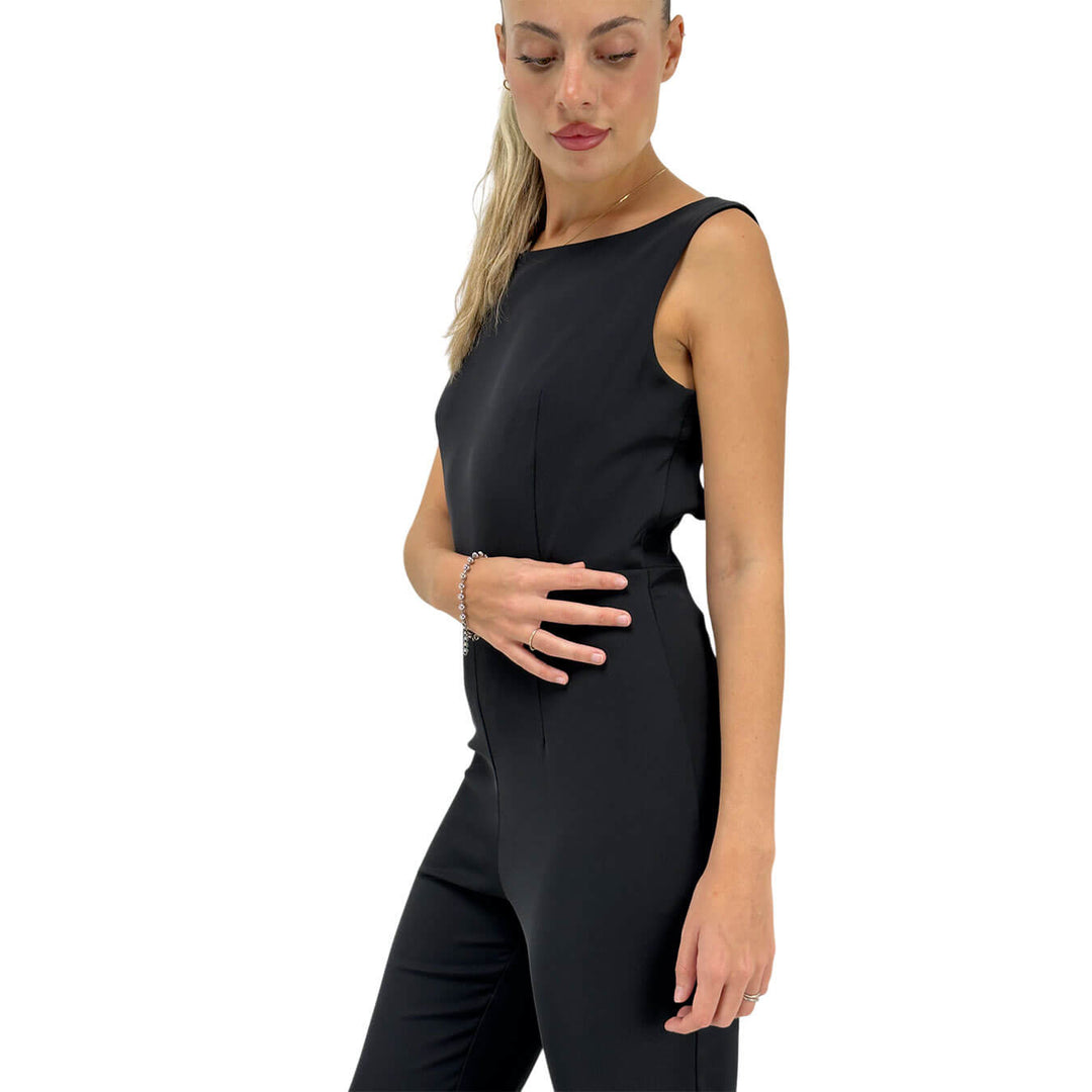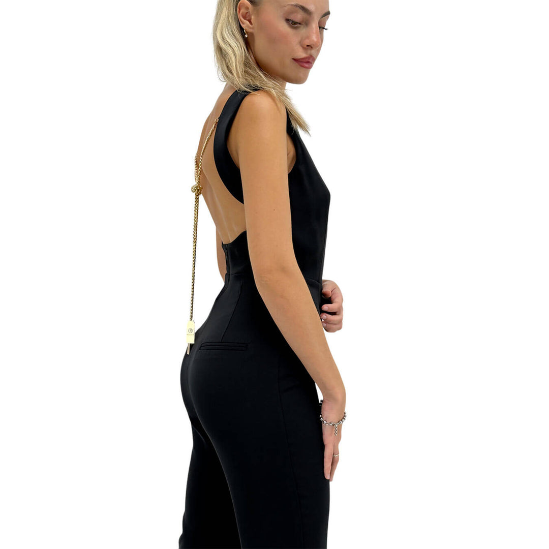 Relish tuta donna, modello Aliqua senza maniche, aperta sulla schiena dona un tocco di sensualità discreta impreziosita dalla collana integrata con placca logo. Perfetta per chi cerca un outfit sofisticato e di carattere, ideale per occasioni speciali o serate glamour. Colore nero. Composizione 96% poliestere, 4% elastane.