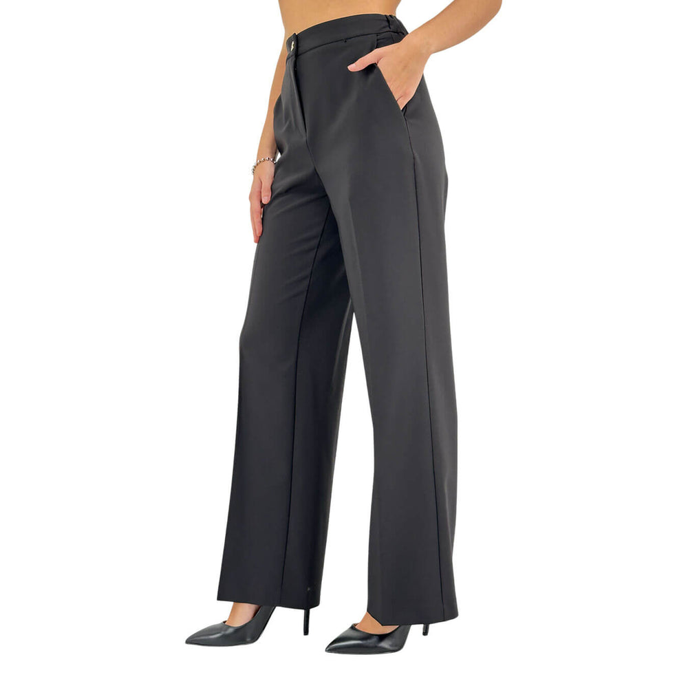 Relish pantaloni donna, modello a palazzo, vita alta con fascia elasticizzata assicura una vestibilità comoda e valorizzante. Chiusura con bottone d'orato, tasche laterali francesi. Colore nero. Composizione 99% poliestere, 1% elastan
