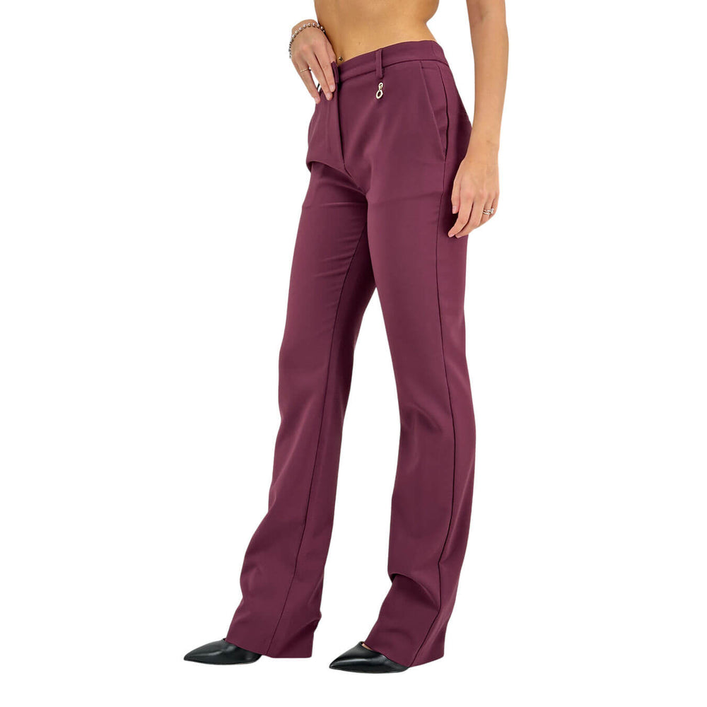 Relish pantaloni donna, modello Cloes a vita alta, le doppie tasche francesi aggiungono un tocco di raffinatezza. La linea a zampa dona al pantalone un tocco moderno e slanciato, perfetto per chi cerca un look chic e versatile, ideale sia per il giorno che per la sera. Colore violet. Composizione 99% poliestere, 1% elastan