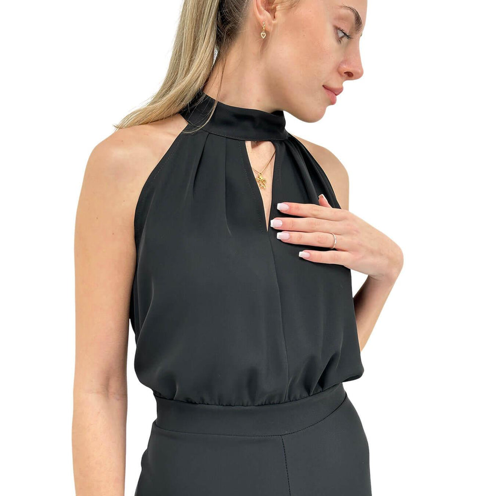 Kontatto c two-piece women's suit, black, made of slightly stretch fabric. Short jacket with 3/4 sleeves, jumpsuit with halter neck and wide trousers, zip closure on the back. Composition: 95% polyester, 5% elastane. Elegant and comfortable, ideal for special occasions, ceremonies or evening events.