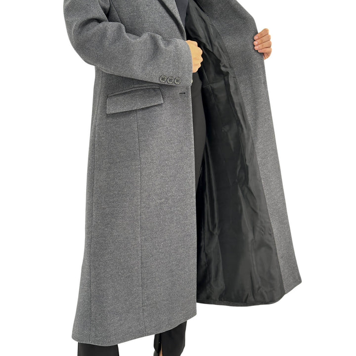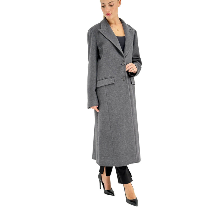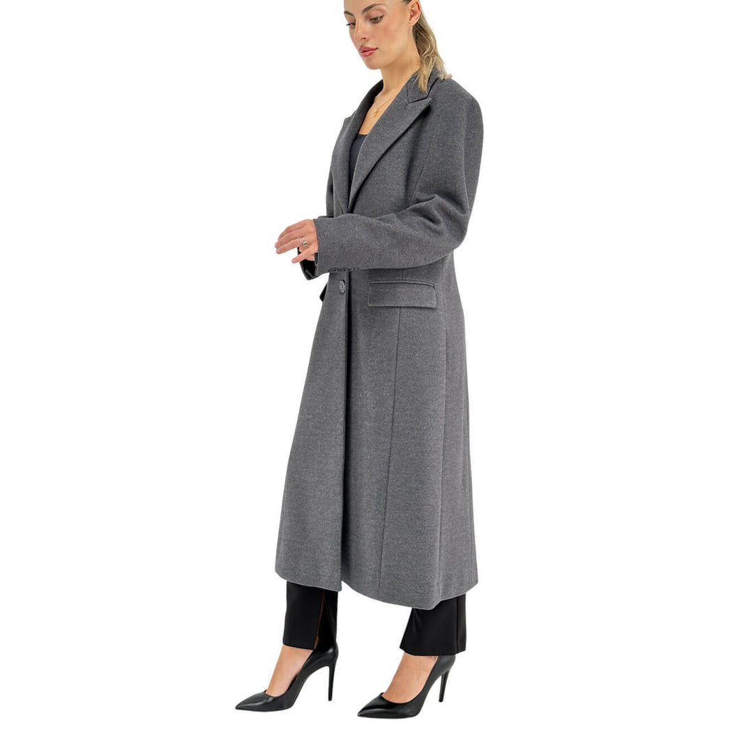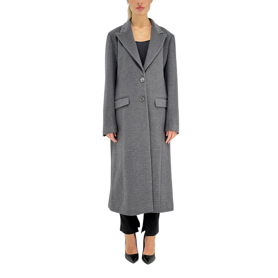 Relish cappotto donna lungo, modello King, avvitato e chiusura a doppiopetto con bottoni. Doppie tasche con patta aggiungono funzionalità senza rinunciare alla raffinatezza. Un capo iconico, perfetto per affrontare la stagione con classe e personalità. Colore grigio. Composizione 92% poliestere, 8% elastan