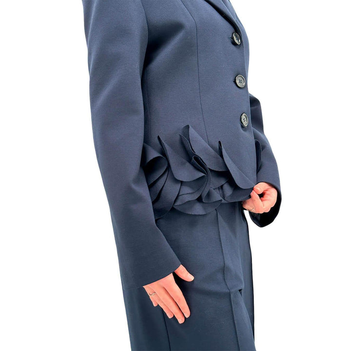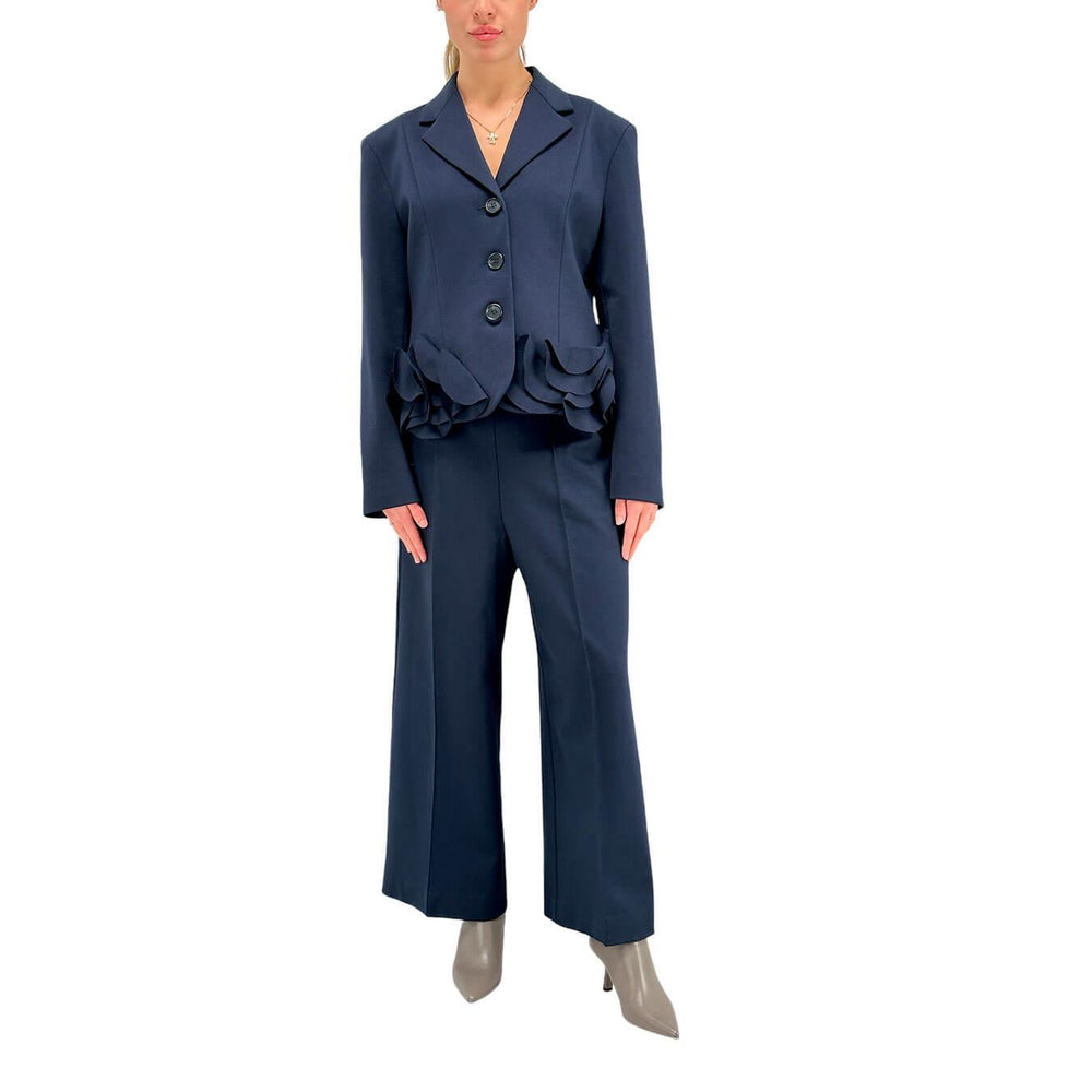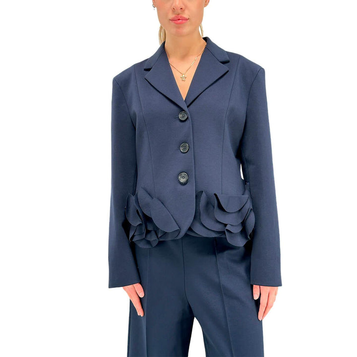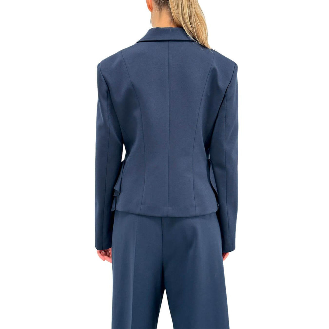 Meimeij women's jacket, made of high-quality mixed fabric, single-breasted model with tone-on-tone buttons. Classic lapel collar, long sleeves and side pockets embellished with decorative flounces. A sophisticated style garment, perfect for adding a touch of elegance to your everyday look. Color: blue. Composition: 65% viscose, 30% polyamide, 5% elastane. Regular fit.