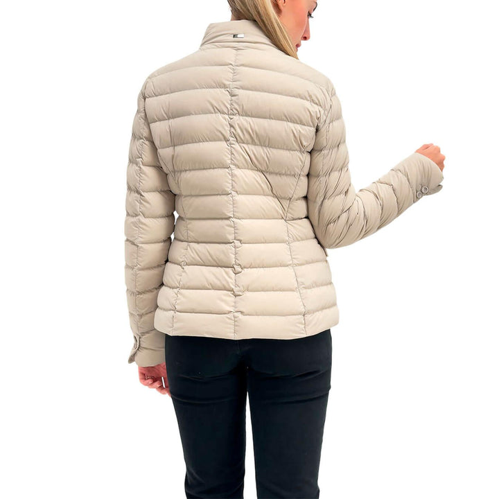 Herno women's quilted down jacket in goose down, hip length and fitted cut to enhance the silhouette. Slightly raised collar, double zip closure and button flap. Long sleeves and practical side pockets with flap for a functional and refined look. Chantilly color . Composition: 86% polyamide 14% elastane, padding 70% feather, 30% polyester. Regular fit.