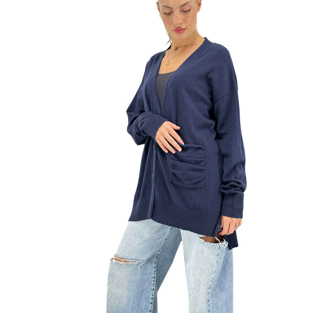 Relish cardigan donna, modello Salamina, scollo a V classico e dettagli contemporanei come il fondo asimmetrico con spacchi laterali. I bottoni aggiungono versatilità, rendendolo perfetto per look sofisticati e casual chic. Colore blu. Composizione 95% cotone, 5% cashmere