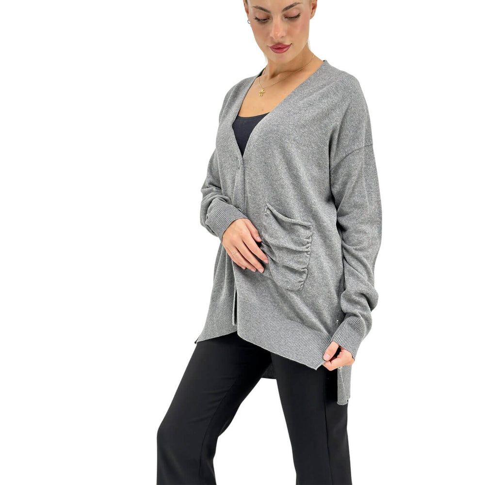 Relish cardigan donna, modello Salamina, scollo a V classico e dettagli contemporanei come il fondo asimmetrico con spacchi laterali. I bottoni aggiungono versatilità, rendendolo perfetto per look sofisticati e casual chic. Colore grigio. Composizione 95% cotone, 5% cashmere
