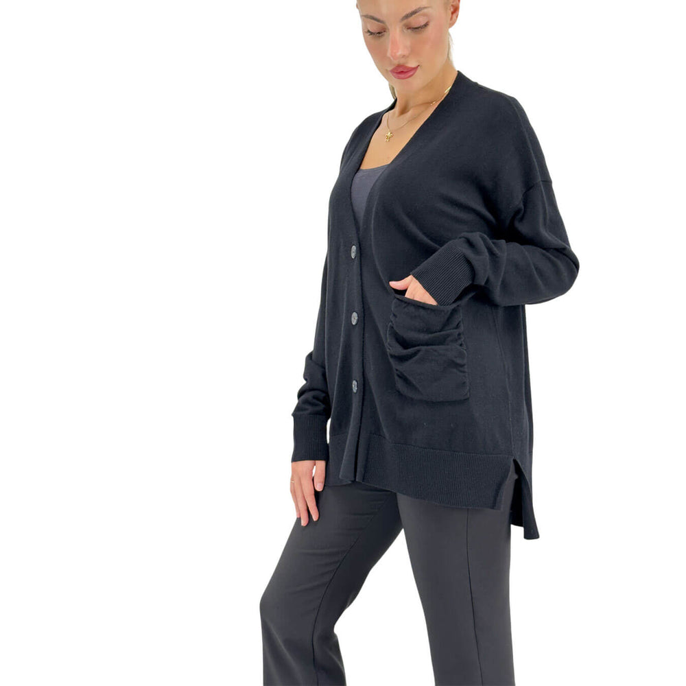 Relish cardigan donna modello Salamina, scollo a V classico e fondo asimmetrico, manica lunga con polsino, spacchi laterali per un effetto di movimento e stile. Chiuso con bottoni. Colore nero. Composizione 95% cotone, 5% cashmere.