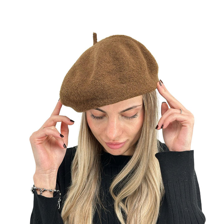 Women's Basque Hat, made of wool blend, beret style. This one-piece accessory is a classic and timeless accessory, characterized by the typical lively tip on the top. Composition: 50% wool, 50% acrylic. Color: Brown.