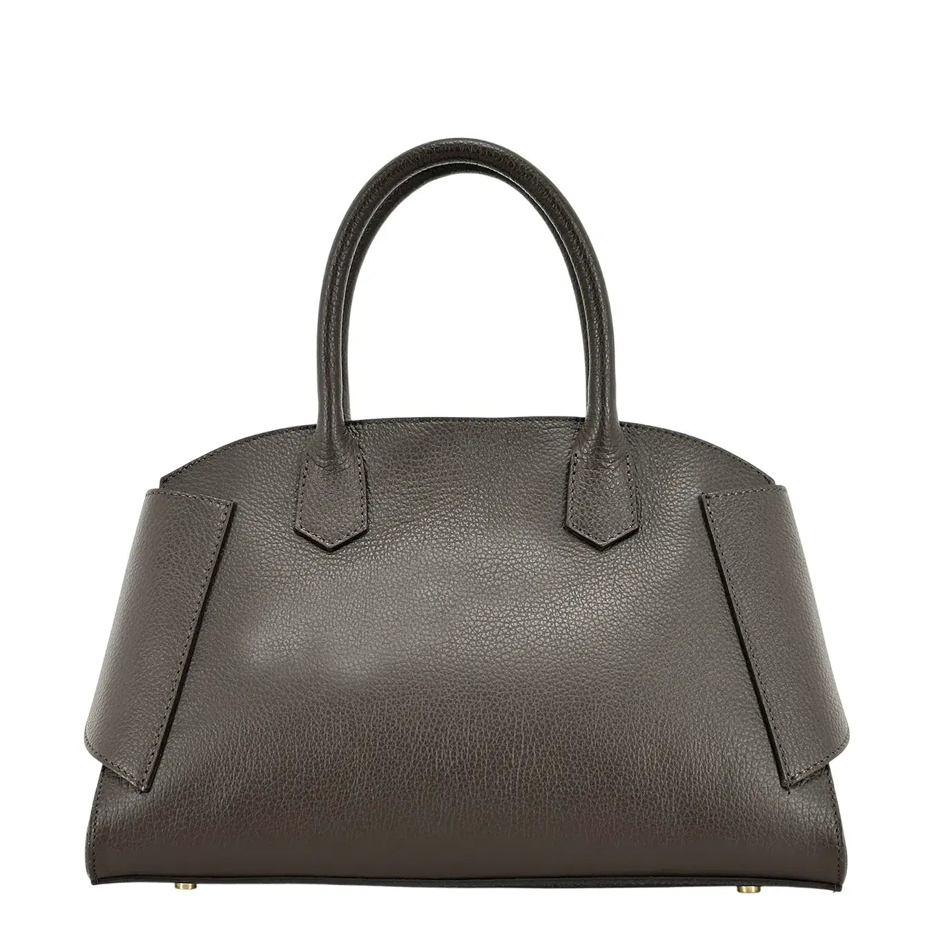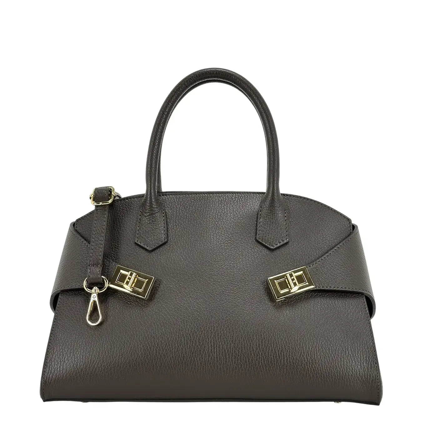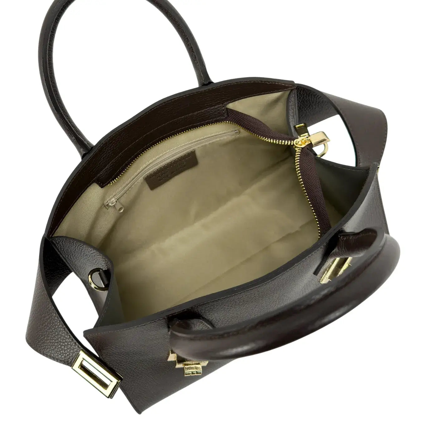 Borsa Bassini in vera pelle color cioccolato con due manici, elegante e versatile, perfetta per chi cerca stile e funzionalità. La chiusura con zip è arricchita da un doppio girello ornamentale in metallo color oro che conferisce un dettaglio raffinato, mentre la tracolla regolabile e removibile con moschettone garantisce comfort e adattabilità. L’interno foderato in tessuto con tasca chiusa con zip offre praticità e organizzazione. Con dimensioni di 31 x 19 x 16 cm, è ideale per completare look quotidiani o più sofisticati.