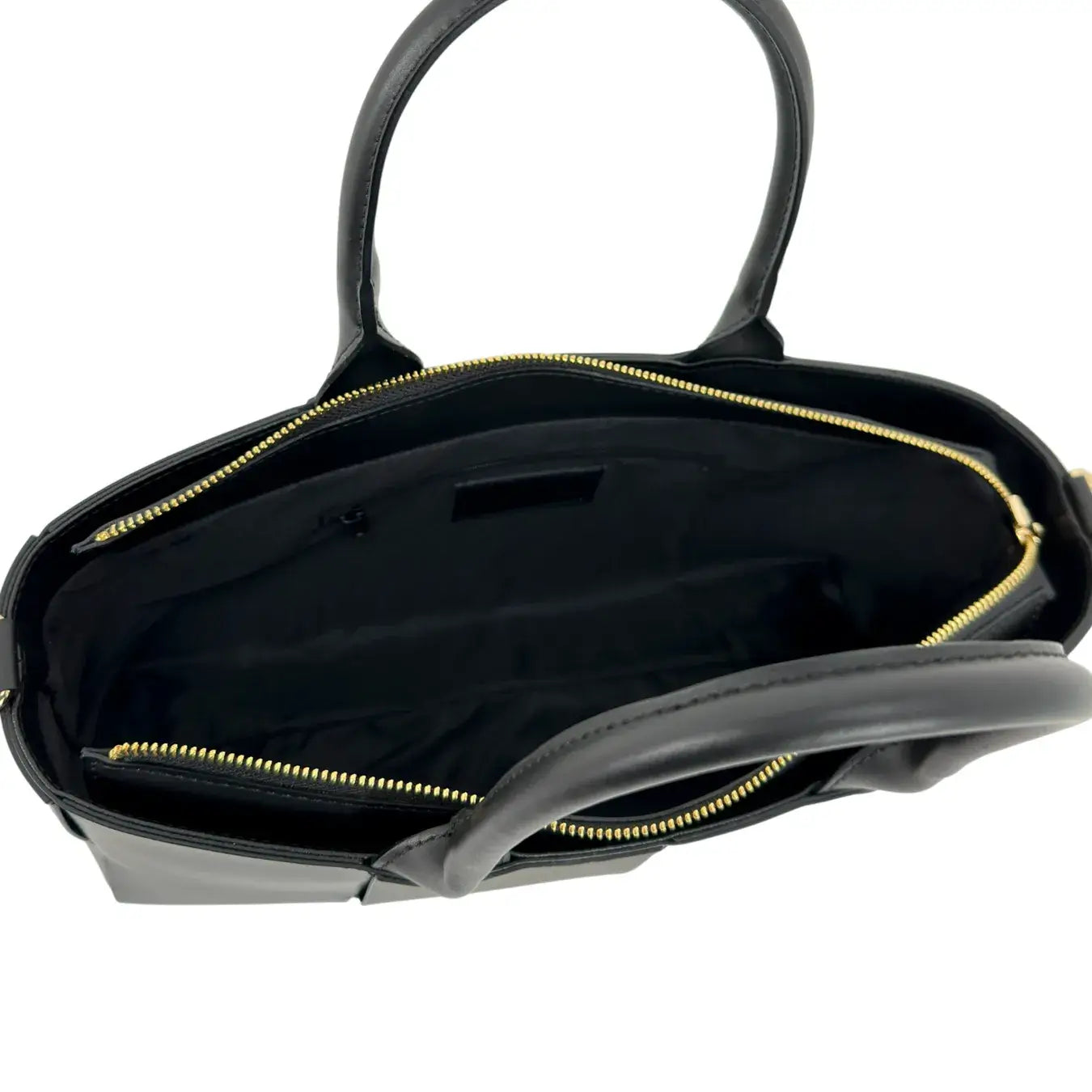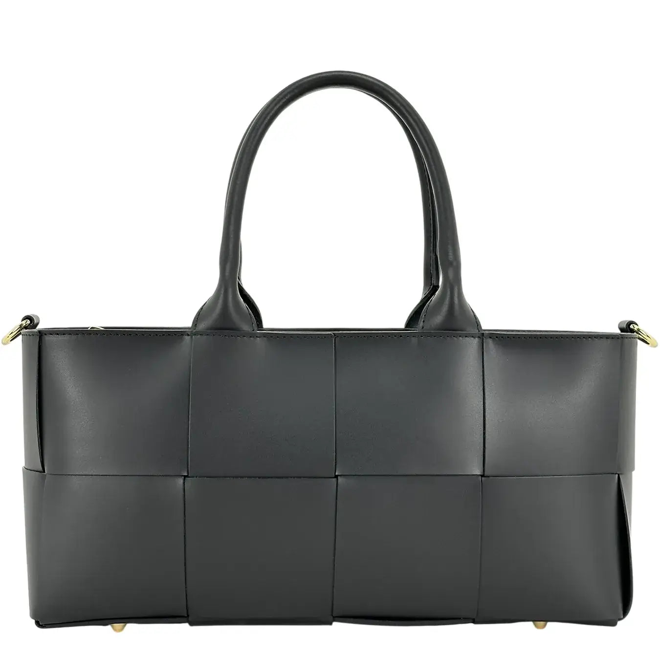 Borsa Bassini in vera pelle intrecciata nera con due manici, elegante e versatile, perfetta per chi cerca un accessorio raffinato e pratico. La tracolla removibile con moschettone offre comfort e adattabilità, mentre l’interno foderato in tessuto con tasca chiusa con zip garantisce organizzazione e funzionalità. Con dimensioni di 35 x 17 x 10 cm, è ideale per completare look quotidiani o più sofisticati, aggiungendo un tocco di classe al guardaroba.