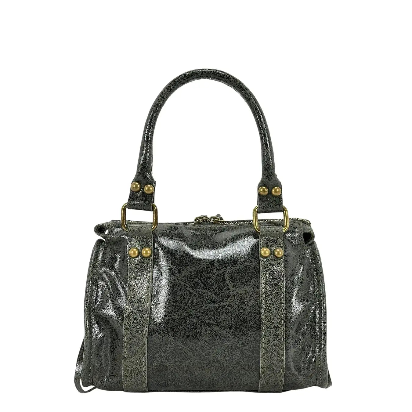 Borsa da città Bassini in vera pelle verde effetto vintage di misura piccola, pensata per chi cerca un accessorio dal carattere deciso e funzionale. La pelle morbida e resistente è arricchita da borchie e fibbie color ottone che conferiscono un tocco ricercato, mentre i due manici a spalla e la tracolla rimovibile con moschettoni garantiscono comfort e versatilità. La tasca frontale con zip e l’interno foderato con tasca chiusa assicurano praticità quotidiana. Con dimensioni di 23 x 17 x 12 cm, è perfetta per completare look casual o chic.