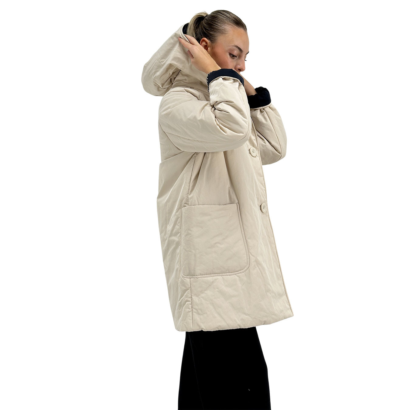 Il cappotto double panna e blu medio con cappuccio di Oof unisce stile contemporaneo e funzionalità in un capo versatile e di tendenza. Realizzato in 100% poliestere, offre comfort e calore senza appesantire la silhouette. Il logo a rilievo aggiunge un dettaglio esclusivo, mentre la combinazione di colori raffinata lo rende ideale su look casual o smart-casual. Perfetto su jeans o pantaloni sartoriali, questo cappotto è la scelta ideale per affrontare l’inverno con eleganza moderna.