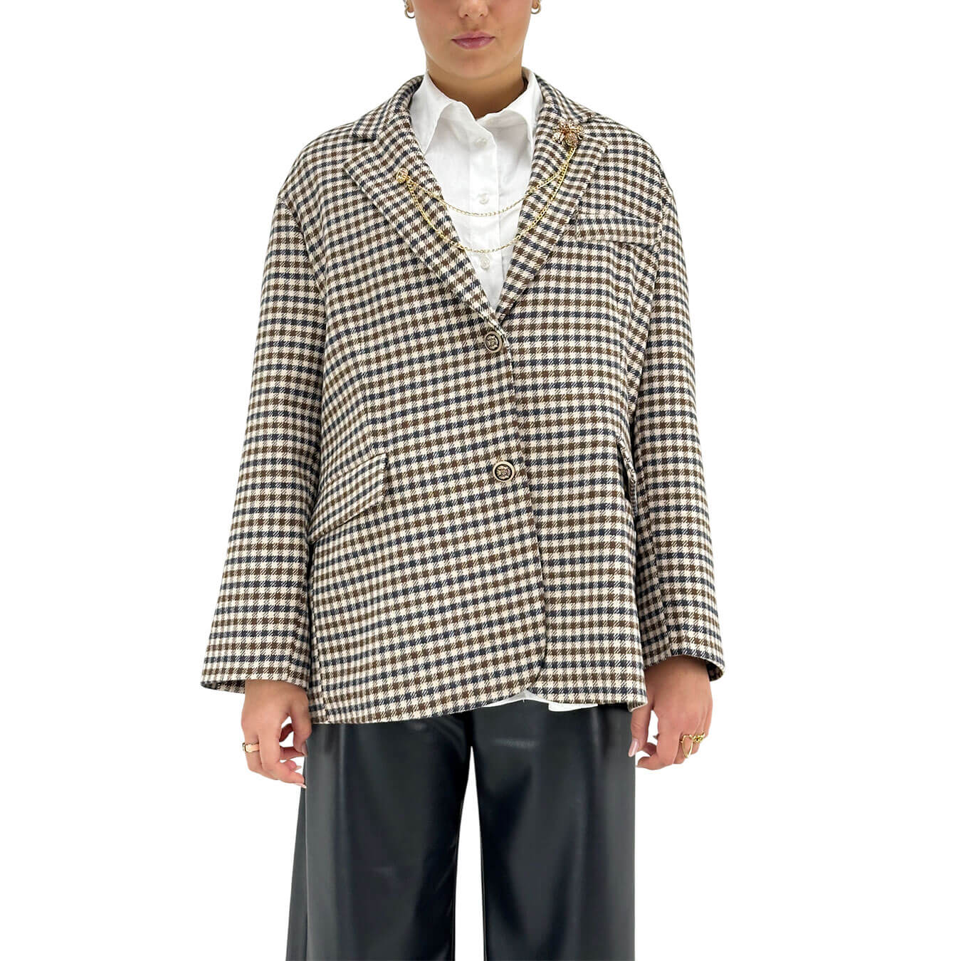 La giacca marrone pied de poule Tensione In unisce eleganza e stile contemporaneo. Realizzata in un mix di acrilico, poliestere, lana e altre fibre, offre una vestibilità over confortevole e raffinata. La spilla con catena color oro aggiunge un tocco esclusivo e femminile, rendendo il capo perfetto per look da ufficio o outfit smart-casual. Si abbina facilmente a pantaloni a sigaretta o gonne midi per un’eleganza senza sforzo. Codice: 2526b1193