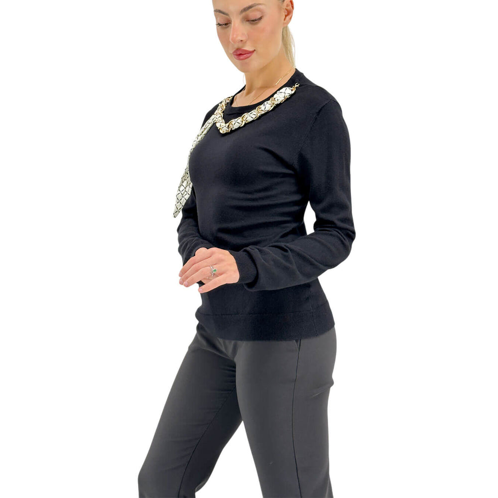 Relish maglia girocollo, modello Isotta, manica lunga con polsino, colletto impreziosito da una catena decorativa che si intreccia con il foulard. Perfetta per look da giorno sofisticati o per aggiungere carattere a un outfit serale. Colore nero. Composizione 80% viscosa, 20% poliammide.