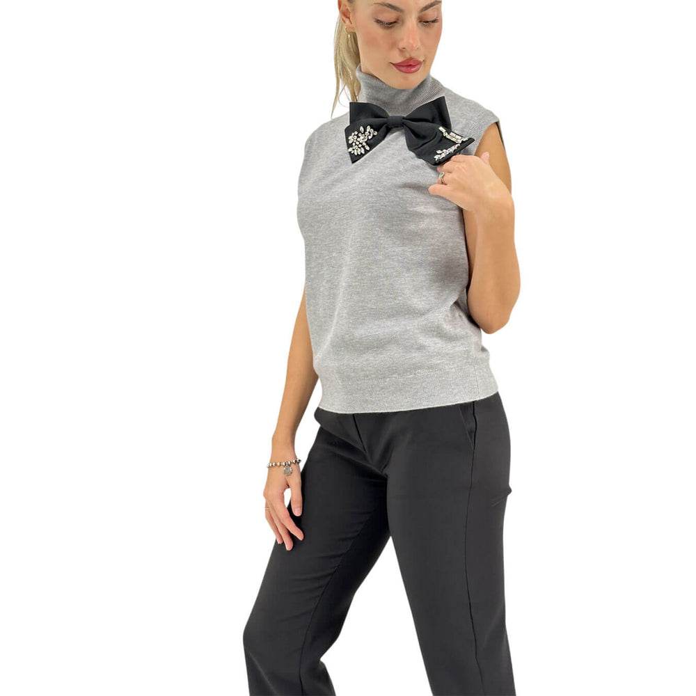 Relish maglia gilet a collo alto, modello Nasso, spilla rimovibile con maxi fiocco decorativo e pietre luminose. Colore grigio. Composizione 50% viscosa, 30% poliestere, 20% poliammide