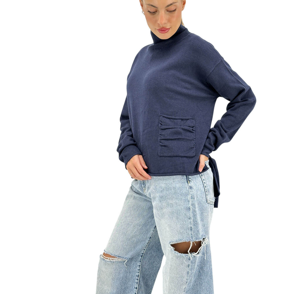 Relish maglia donna, modello Paxi, collo alto, manica lunga con polsino, il taschino applicato sul davanti dona un tocco casual e contemporaneo, perfetto per chi ama i dettagli non convenzionali. Realizzata in un tessuto morbido e confortevole, è il capo ideale da indossare tutti i giorni con stile, dal lavoro al tempo libero. Colore blu. Composizione 95% cotone, 5% cashmere