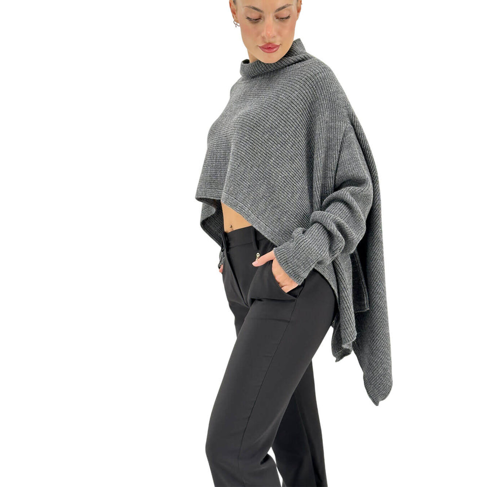 Relish maglia donna, modello Taso, collo alto con effetto mantella creano un look contemporaneo e sofisticato. Un capo versatile che unisce comodità e stile, perfetto per chi ama osare con dettagli unici senza rinunciare alla praticità. Colore girigio. Composizione 75% acrilico, 10% viscosa, 10% lana, 5% alpaca