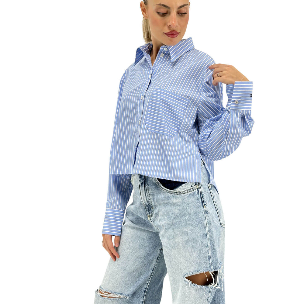 Ottod'Ame camicia cropped a righe sottili, caratterizzata da un orlo asimmetrico e dal ricamo in corsivo del brand, perfetta per chi ama osare ed emergere con stile unico. Colore Bianco e Azzurro. Composizione 100% cotone.