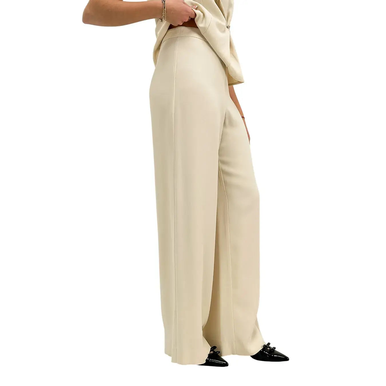 Eleganti e fluidi, i pantaloni Ottod'Ame in tonalità latte presentano una linea ampia che valorizza la silhouette con naturalezza. Realizzati in tessuto leggero e luminoso, assicurano comfort e una vestibilità sofisticata, perfetta per outfit raffinati da giorno o sera. Ideali da abbinare a bluse o top essenziali per un look moderno e di tendenza.
