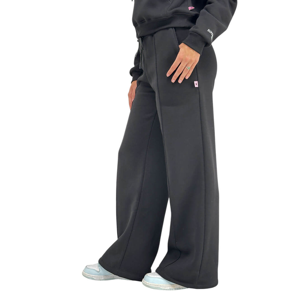 Superculture black fleece palazzo pants are the perfect blend of comfort and casual style. The logo on the ankle and the side label add a unique detail, perfect for those who love a trendy, urban look, ready to conquer the day with a touch of originality.
