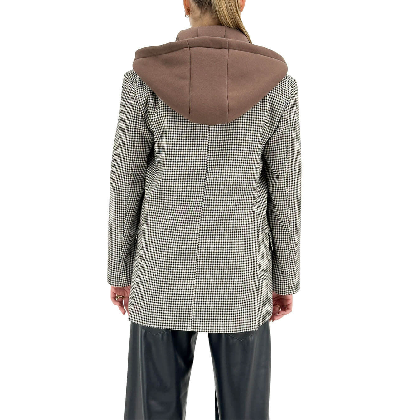 La giacca marrone pied de poule Tensione In unisce stile contemporaneo e comfort. Realizzata in 50% cotone e 50% poliestere, presenta una vestibilità over, monopetto e cappuccio rimovibile per massima versatilità. I pendenti in maglia metallica color argento con strass aggiungono un dettaglio esclusivo e raffinato. Perfetta per outfit casual-chic o look da città, si abbina a pantaloni a sigaretta o jeans chiari. Aggiungi subito questo capo di tendenza al tuo guardaroba. Codice: 2537615