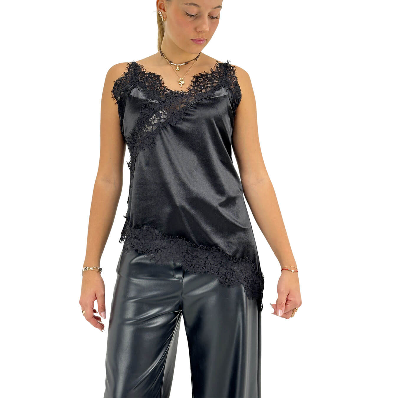 Il top nero Tensione In è un capo femminile e raffinato, realizzato in 65% poliestere e 5% elastan per garantire comfort e vestibilità perfetta. Le rifiniture in pizzo tono su tono e le bretelline regolabili aggiungono un tocco elegante e sofisticato, ideale per look casual-chic o serate in città. Perfetto da abbinare a gonne midi, pantaloni a sigaretta o jeans per un outfit versatile e di tendenza. Codice: 25fw250068