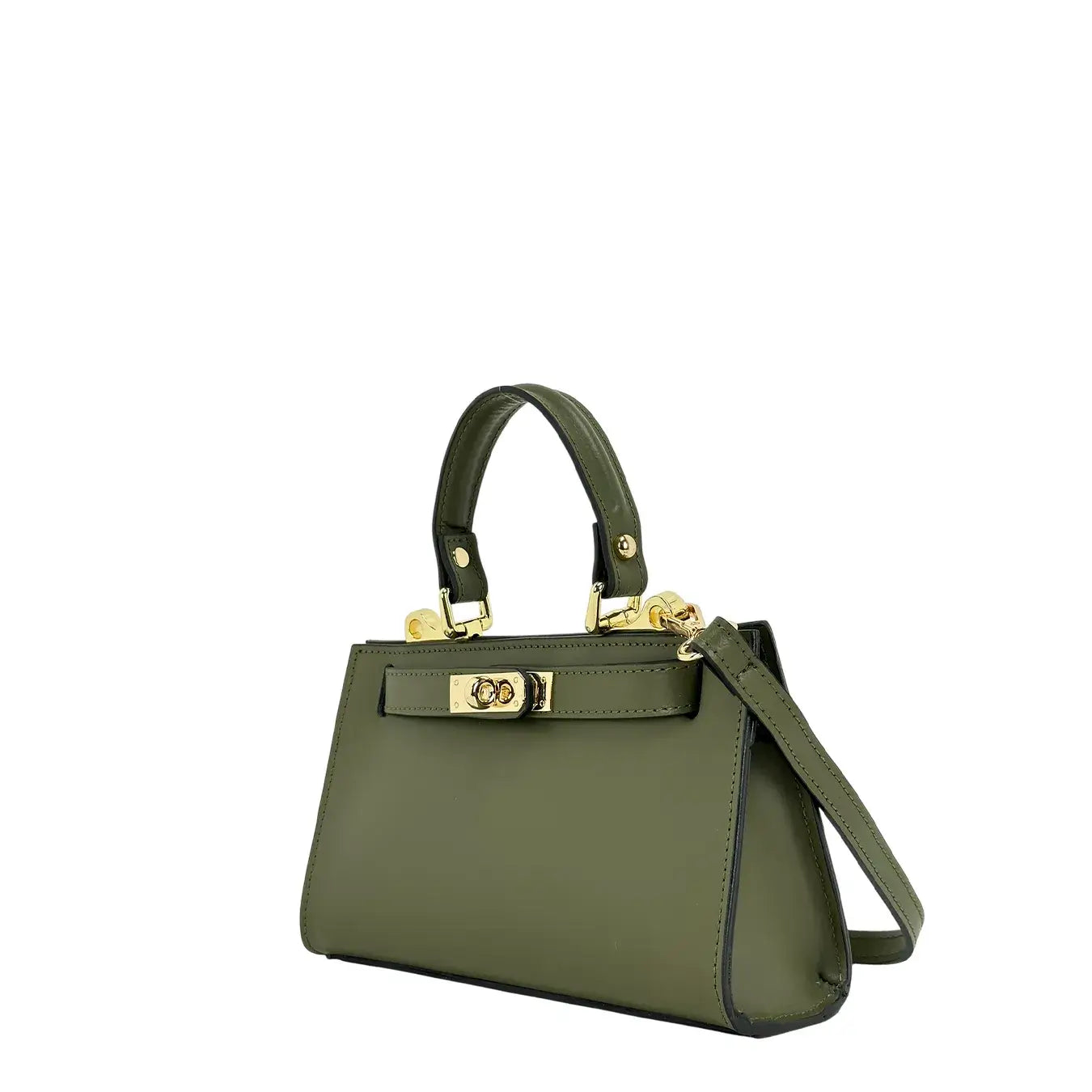Borsa Bassini mini in vera pelle color avocado con maniglia, elegante e compatta, perfetta per chi ama accessori di carattere e pratici. Le cinghie con chiusura a fermaglio e il rocchetto in metallo color oro aggiungono dettagli sofisticati, mentre l’interno foderato con tasca chiusa garantisce funzionalità quotidiana. La tracolla regolabile e rimovibile con moschettone assicura versatilità e comfort. Con dimensioni di 24 x 14 x 7 cm, è ideale per completare look casual o chic con un tocco di stile unico.