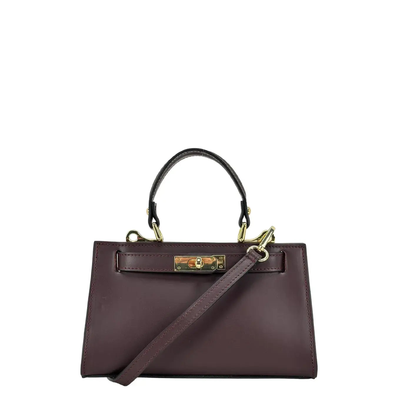 Borsa Bassini mini in vera pelle bordeaux con maniglia, elegante e compatta, pensata per chi desidera un accessorio pratico e di stile. Le cinghie con chiusura a fermaglio e il rocchetto in metallo color oro arricchiscono il design, mentre l’interno foderato con tasca chiusa garantisce organizzazione e funzionalità. La tracolla regolabile e rimovibile con moschettone assicura versatilità e comfort. Con dimensioni di 24 x 14 x 7 cm, è perfetta per completare look casual o chic con un tocco raffinato.