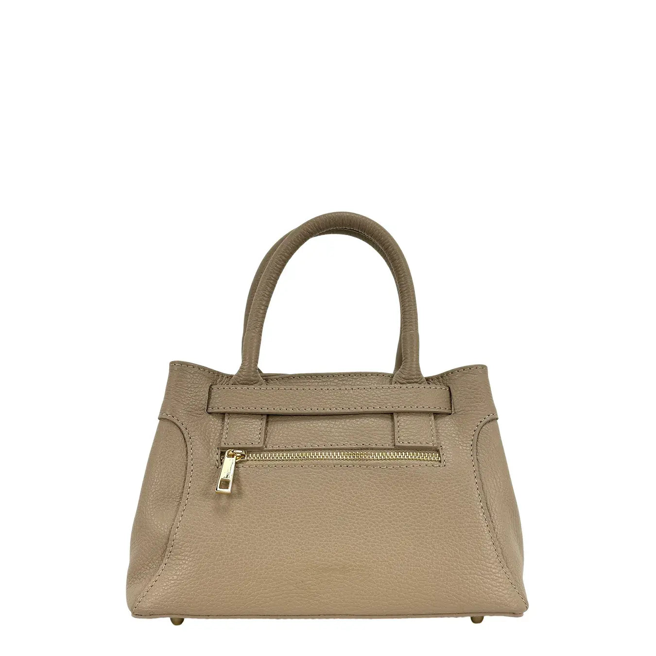 Borsa Bassini in vera pelle beige con due manici, elegante e versatile, pensata per chi cerca stile e praticità in un accessorio unico. Le cinghie con chiusura a fermaglio e il rocchetto in metallo color oro aggiungono dettagli sofisticati, mentre la chiusura con zip metallica e l'interno foderato con tasca chiusa garantiscono funzionalità quotidiana. La tracolla regolabile e rimovibile con moschettone completa il design, rendendo la borsa perfetta per look casual o professionali. Dimensioni cm. 26x19x14.