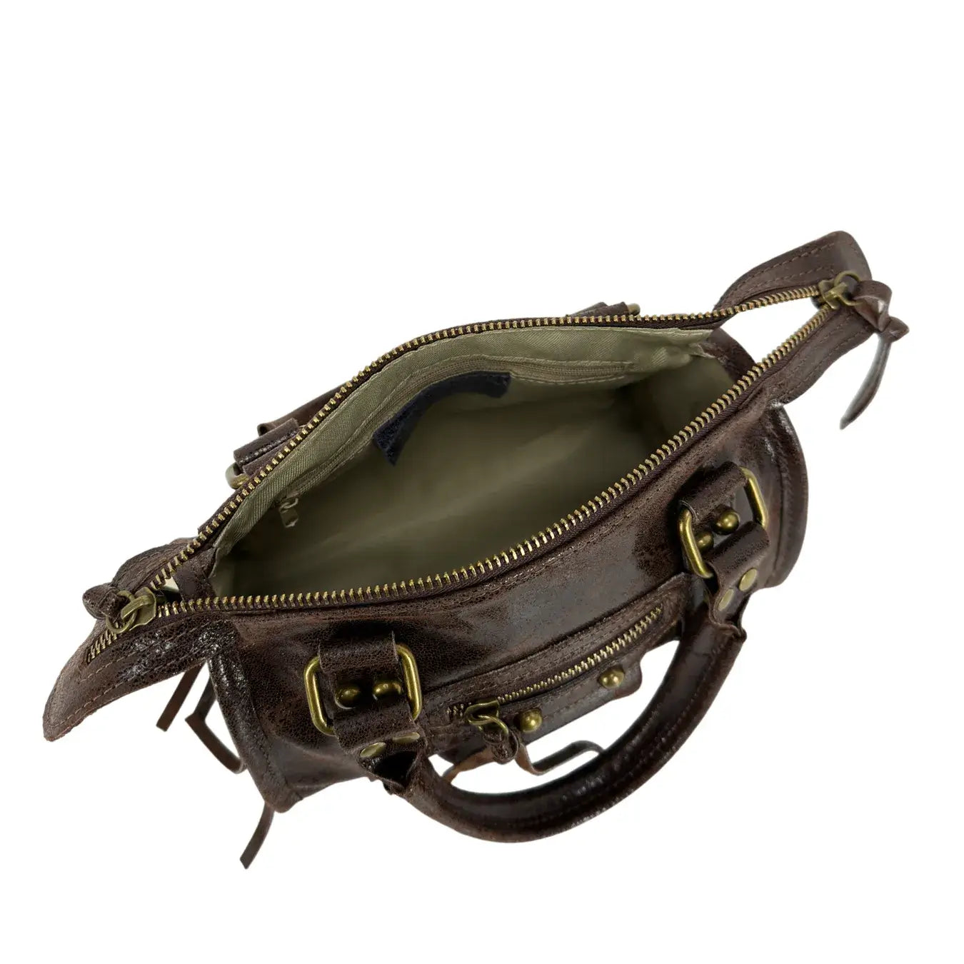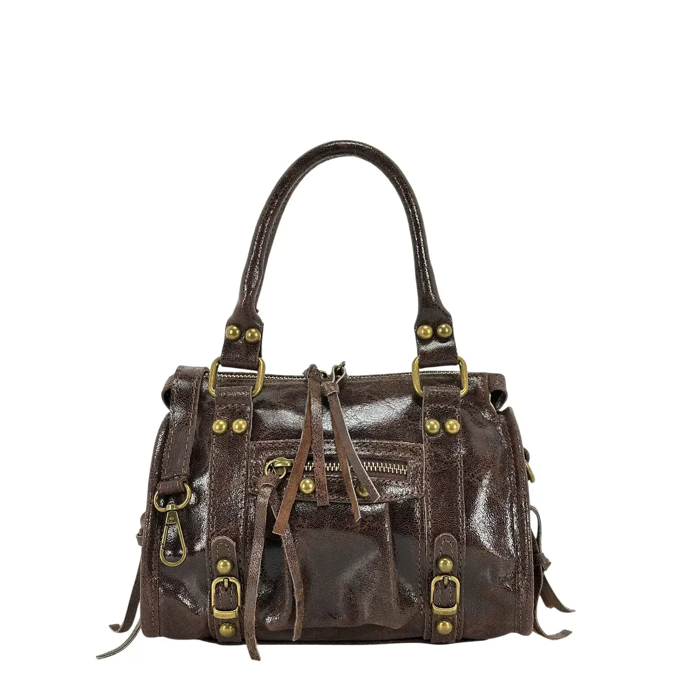 City bag Bassini in vera pelle color marrone effetto vintage di misura piccola, perfetta per chi desidera un accessorio compatto ma ricco di stile. La pelle morbida e resistente è impreziosita da borchie e fibbie color ottone che donano carattere e un’allure contemporanea. I due manici a spalla e la tracolla rimovibile assicurano versatilità, mentre la tasca frontale con zip e l’interno foderato con tasca chiusa garantiscono praticità. Le dimensioni di 23 x 17 x 12 cm la rendono ideale per l’uso quotidiano. Aggiungila ora al tuo guardaroba.