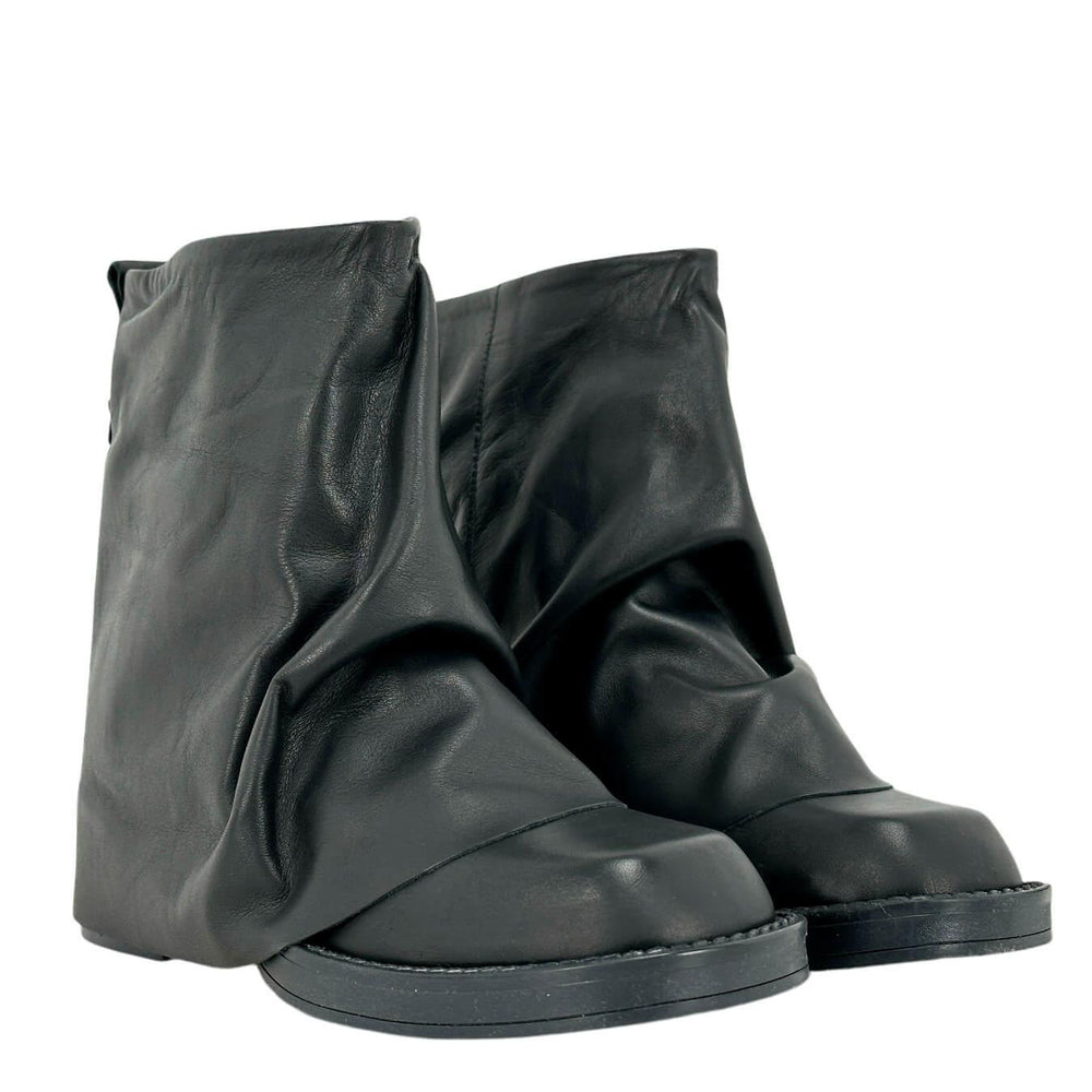 Ovyé women's biker boots in high-quality full-grain leather, with a 5 cm heel for a bold and trendy look. The non-slip rubber sole ensures stability and comfort. A versatile cuff wraps around the shoe, adding a fashionable touch that enriches the bold style of these boots perfect for any occasion. Black color. Regular fit.