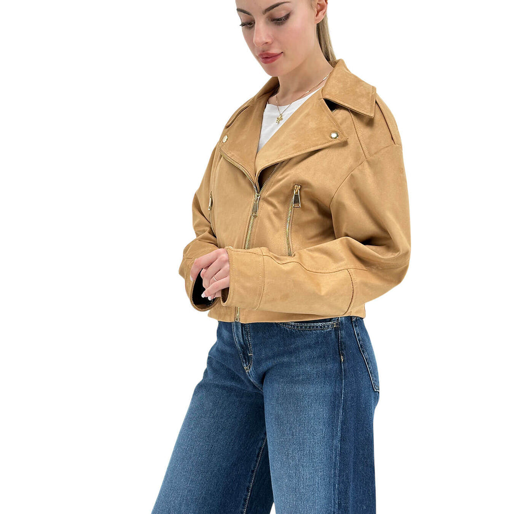 Motel women's jacket, made of synthetic suede effect leather, biker style, notched collar, metal zip closure, side pockets with zip. Long sleeves. Interior lined in tone-on-tone fabric. Beige color. Composition: 50% polyester, 50% polyurethane. Regular fit.