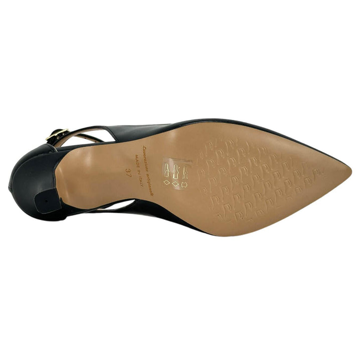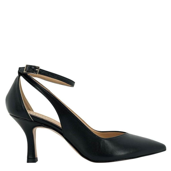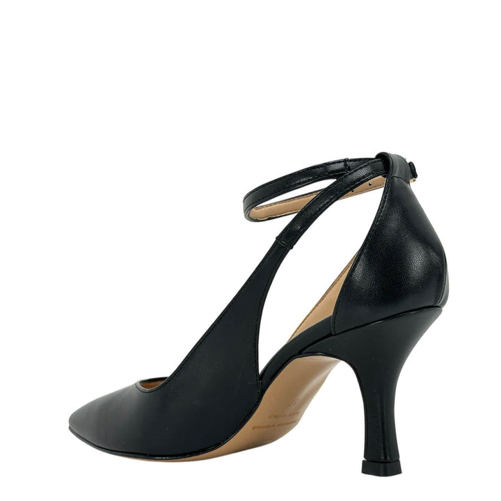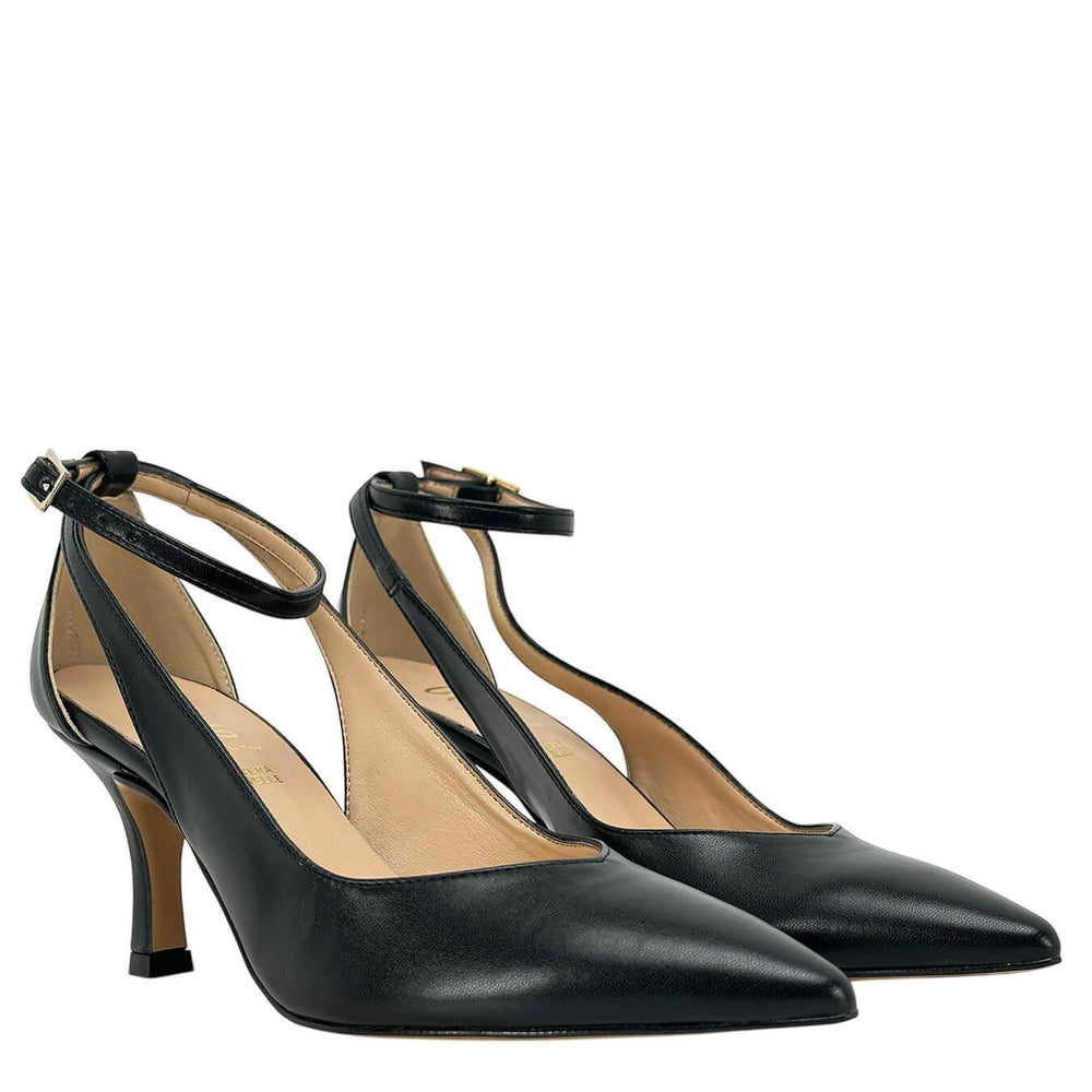 Ovyé women's shoes made of eco-leather, sophisticated décolleté with slightly tapered toe and closed heel. The decorative side holes add a touch of elegance, while the ankle strap with buckle ensures a secure fit. The 8 cm heel slims the figure, perfect for a refined and feminine look. Logo on the insole. Black color. Regular fit.