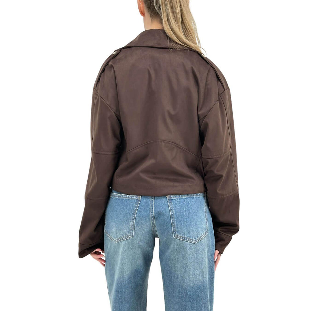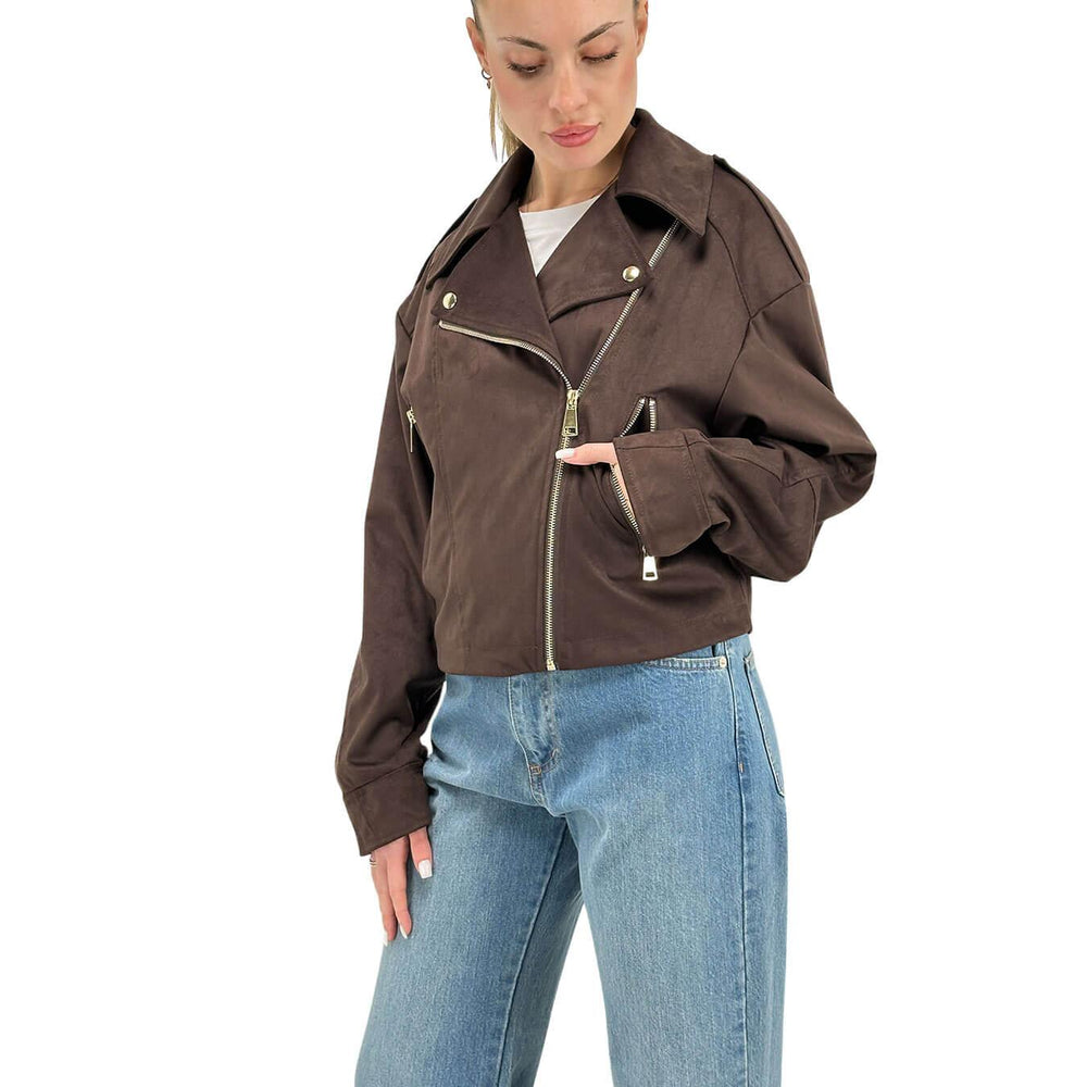 Motel giubbotto donna, realizzato in pelle sintetica effetto camoscio, modello chiodo, collo dentellato, chiusura con cerniera in metallo, tasche laterali con zip. Le maniche lunghe. Interno foderato in tessuto tono su tono. Colore marrone. Composizione: 93% poliestere, 7% elastan. Vestibilità regolare.
