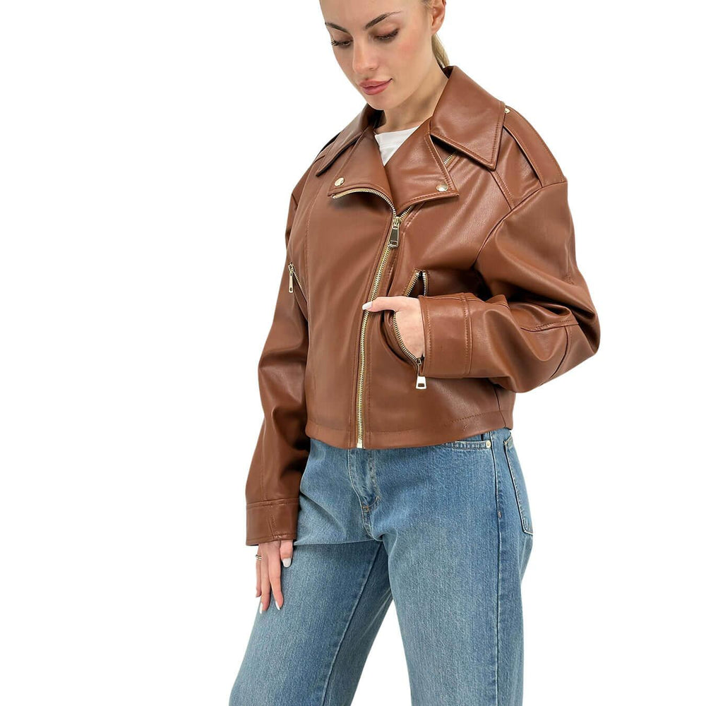 Motel Giubbotto Donna, Modello Chiodo, Pelle Sintetica, Marrone
