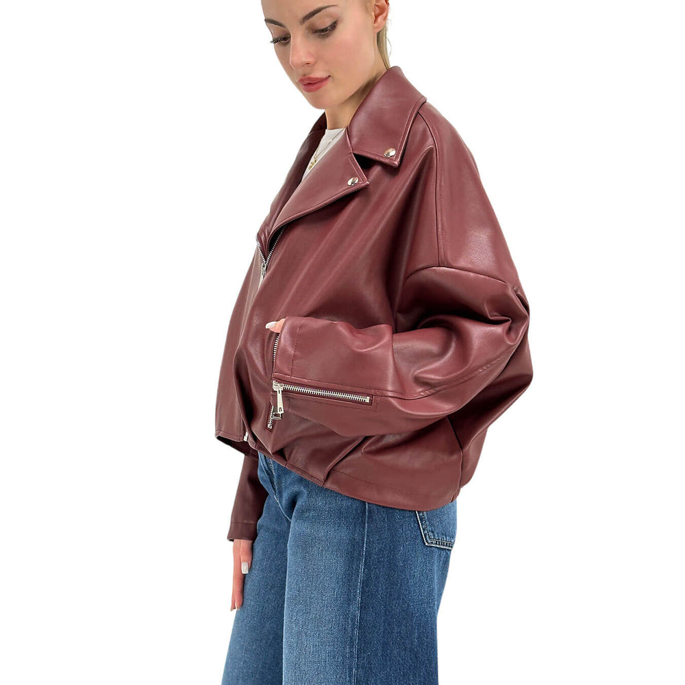 Motel giubbotto donna over, realizzato in pelle sintetica modello chiodo, collo dentellato, chiusura con cerniera in metallo, tasche laterali con zip. Le maniche lunghe. Interno foderato in tessuto tono su tono. Colore rosso. Composizione: 100% poliuretano. Vestibilità over.