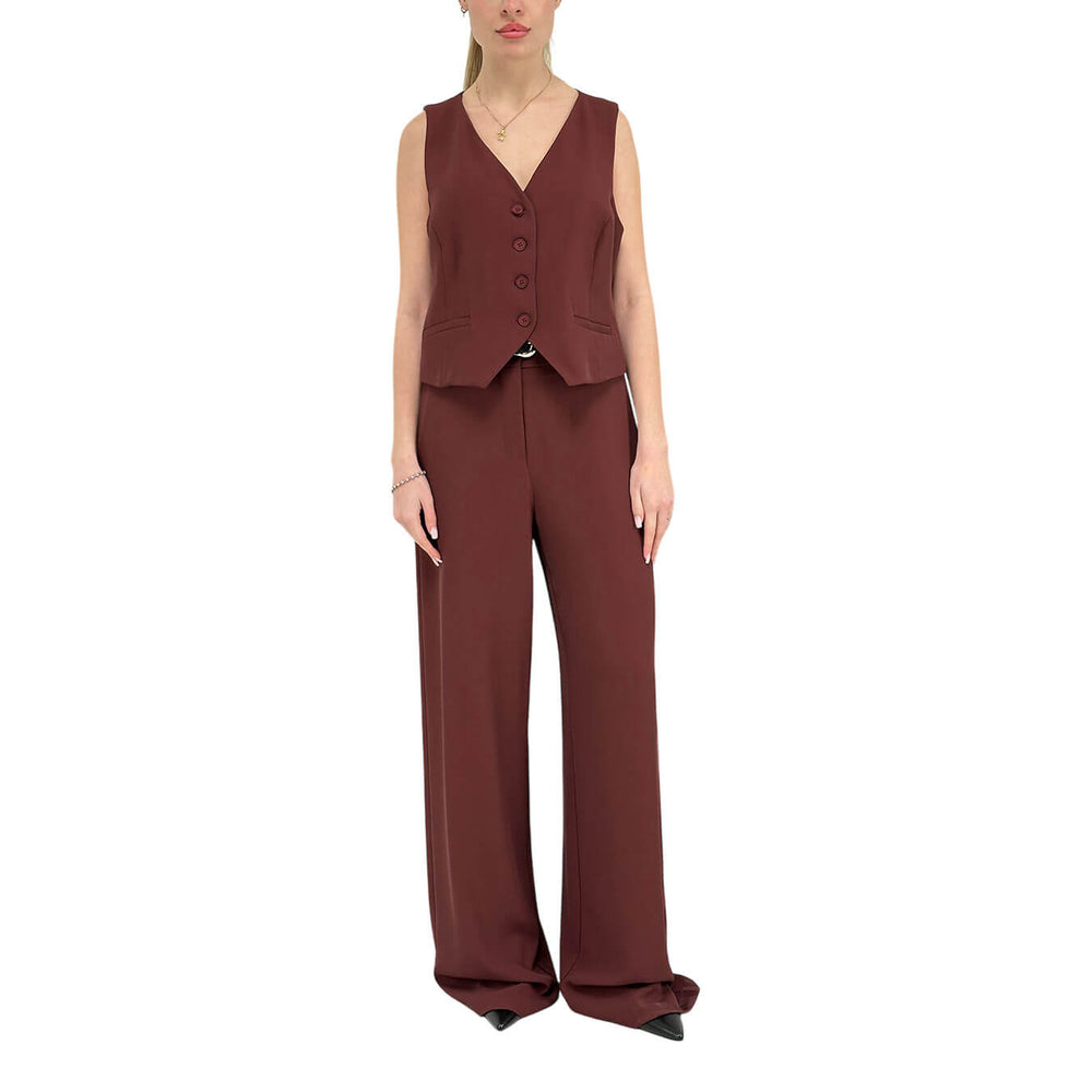 Tensione In gilet donna modello classico, con scollo a V che valorizza la silhouette. Chiusura con bottoni tono su tono per un tocco elegante e distintivo. Dotato di due pratiche tasche a filetto, è perfetto per completare un look formale o casual chic, aggiungendo un dettaglio raffinato a qualsiasi outfit. Colore rosso. Composizione: 96% poliestere, 4% elastan. Vestibilità regolare.
