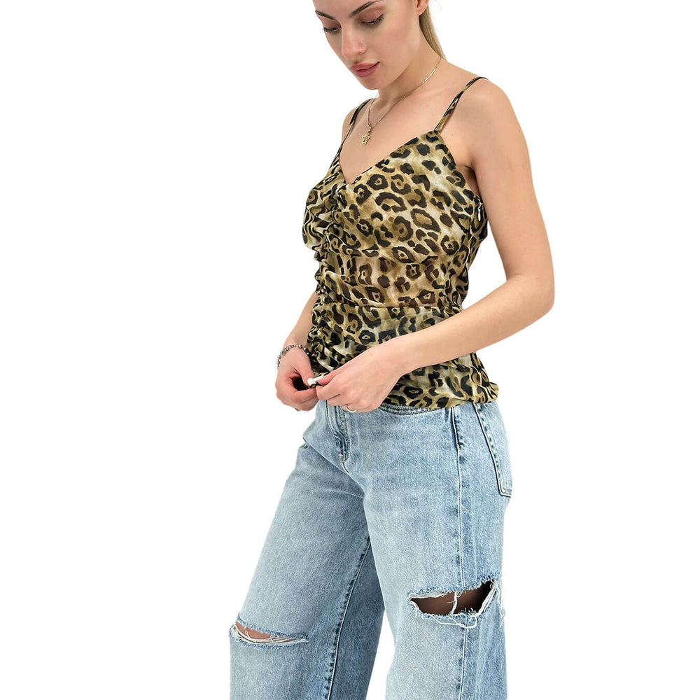Koralline top donna, realizzato in tessuto di ottima qualità fantasia animalier, spalline sottili e parte frontale drappeggiata per un effetto morbido e sensuale. Ideale per look chic e moderni, perfetto da abbinare a gonne o pantaloni per outfit glamour e sofisticati sia di giorno che di sera. Colore beige. Composizione: 100% poliestere.