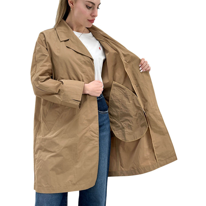 Oof Wear trench donna a media lunghezza, regular fit, realizzato in nylon memory water-repellent, bordato internamente in nylon. Chiusura con bottoni nascosti con patta, scollatura a media profondità con collo revers. Manica lunga con taglio sopra, polso ampio con spacco. Tasche a filetto obliquo completano il design elegante e funzionale. Colore cammello. Composizione: 100% poliestere.