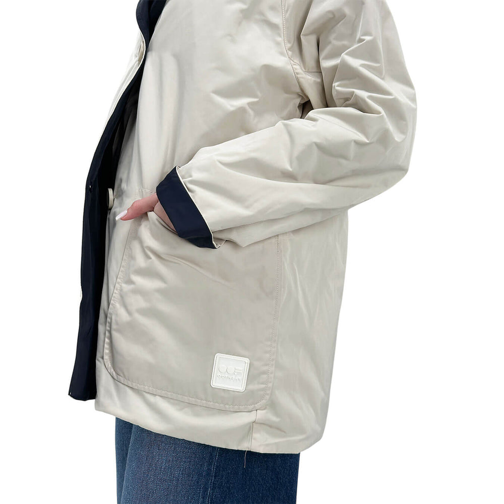 Oof Wear giacca corta donna reversibile, regular fit, realizzata in nylon memory water-repellent. Presenta chiusura anteriore con bottoni, scollo a scialle con cappuccio e manica lunga raglan. Dotata di tasche esterne a toppa e interne inserite sul fianco. Completa il design un patch in silicone logato. Leggera e versatile, ideale per ogni occasione. Colore panna e blu. Composizione: 100% poliestere.