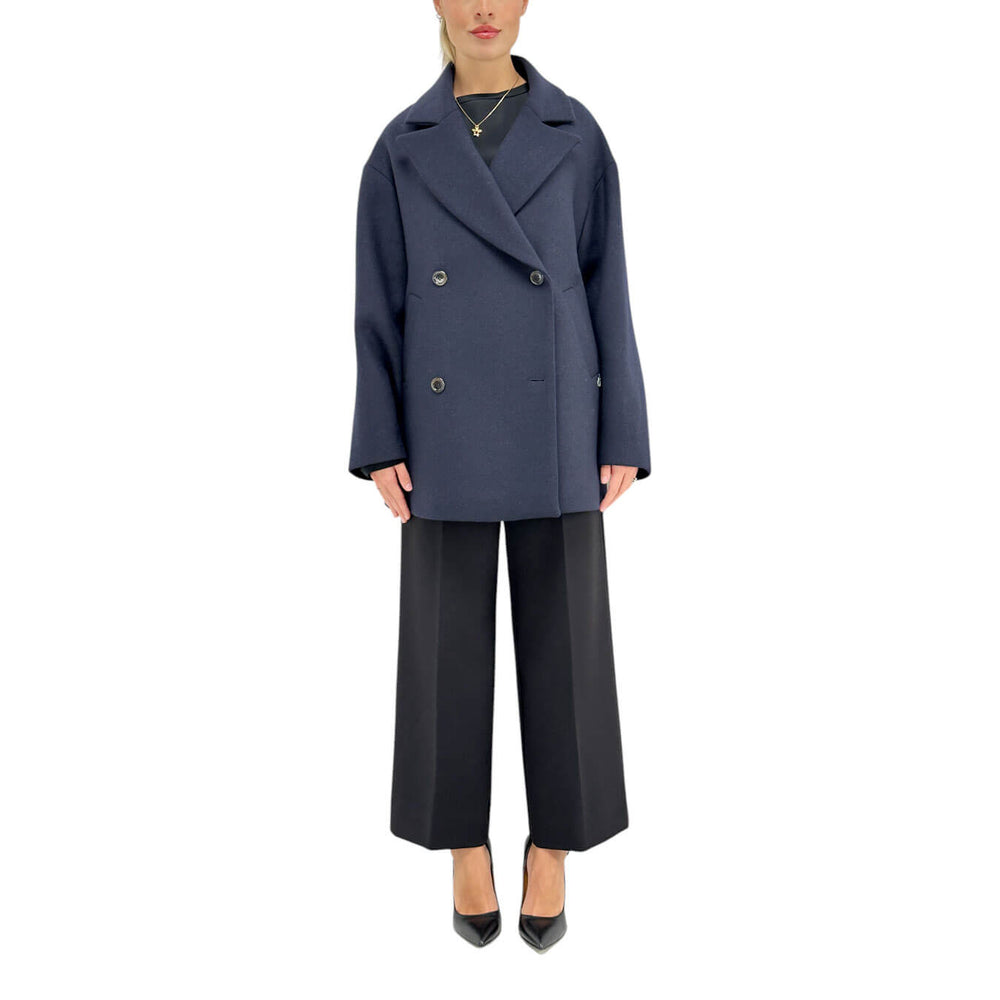 Ottod'Ame cappotto corto caban blu in misto lana con rever in tono coordinato. Questo capo classico aggiunge un tocco di raffinatezza a ogni outfit, garantendo stile e comfort durante le giornate più fredde. Colore blu. Composizione 50% lana, 30% poliestere, 10% acrilico, 10% altre fibre.